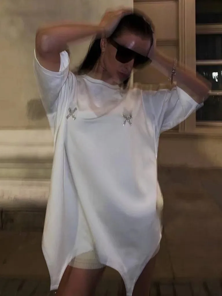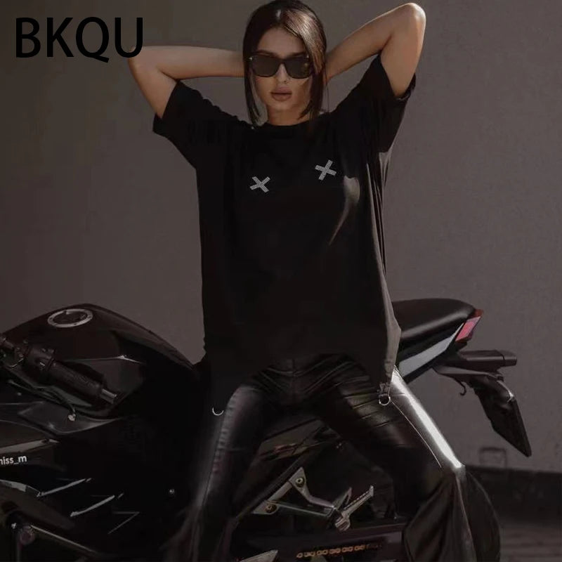 BKQU Rhinestone Loose T shirts for Women 2024 Harajuku Goth Graphic Short Sleeve O-neck Hot Diamonds Female Tees Pullovers Retro