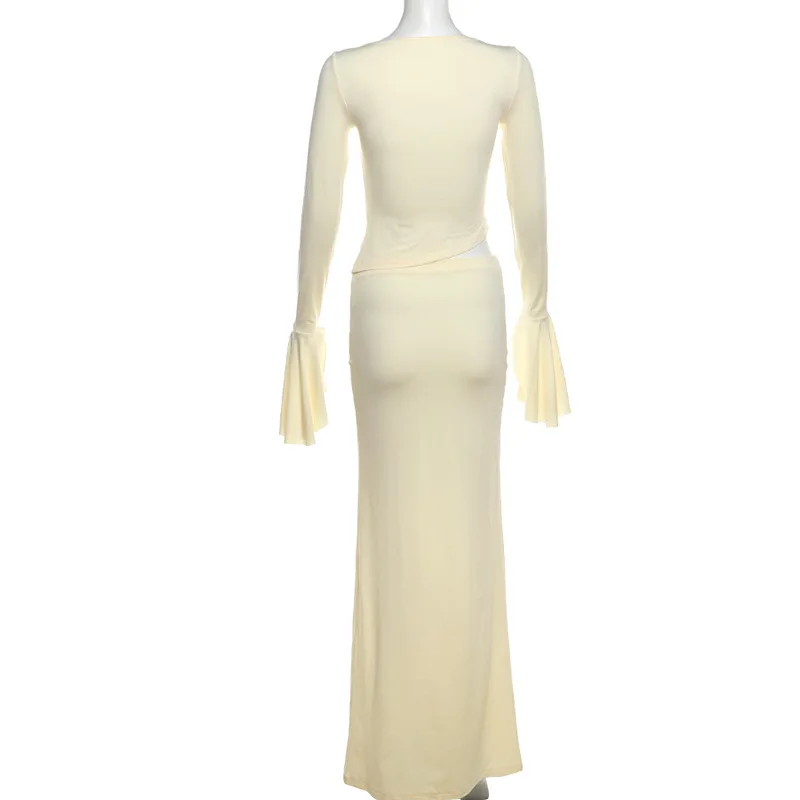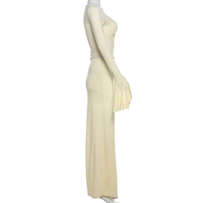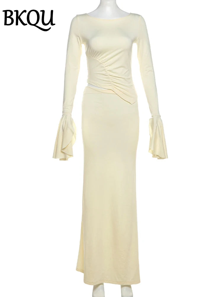 BKQU Ruched Elegant Women Two Piece Dress Outfits Sexy Long Sleeve Irregular Crop Top+Slim Maxi Skirts Set Autumn Party Clothes