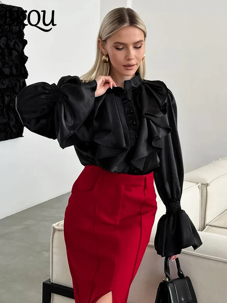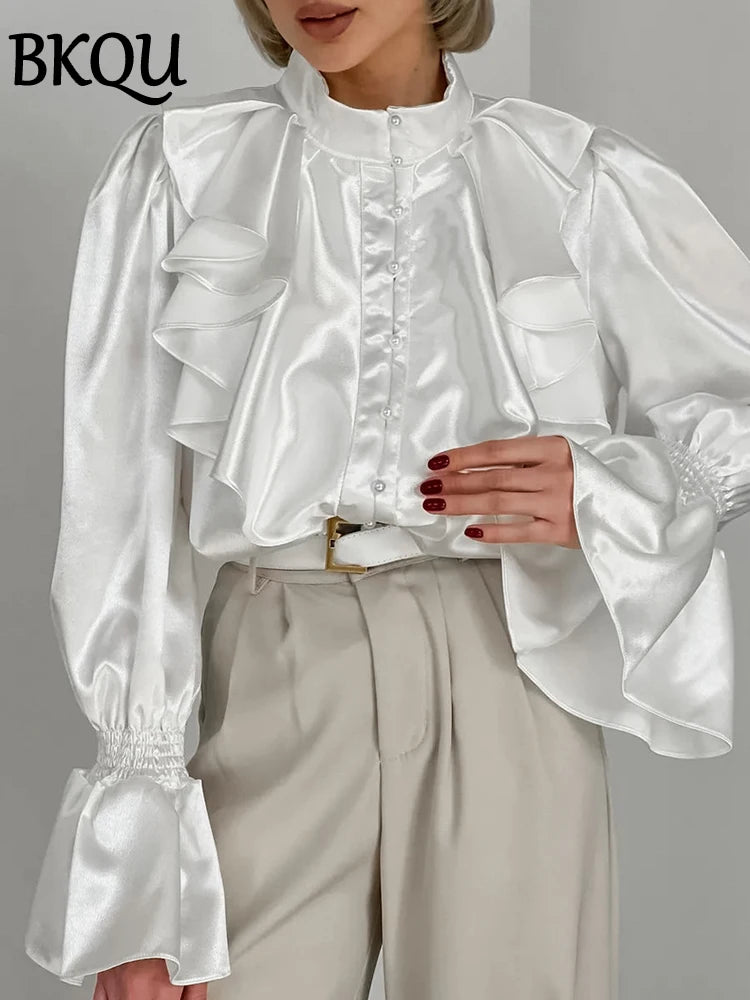 BKQU Satin Woman Ruffles Shirts Elegant Flare Long Sleeves Stand Collar Beading Loose Blouse Office Lady Casual Shirts Tops 2024