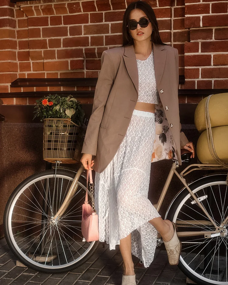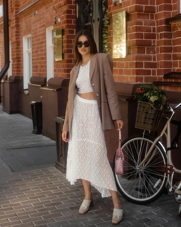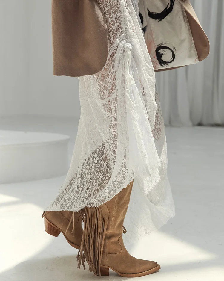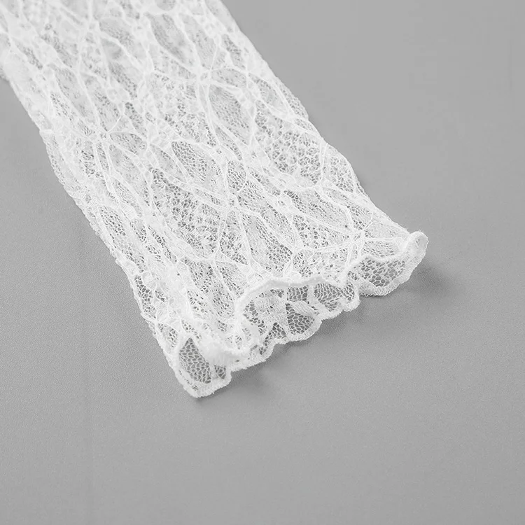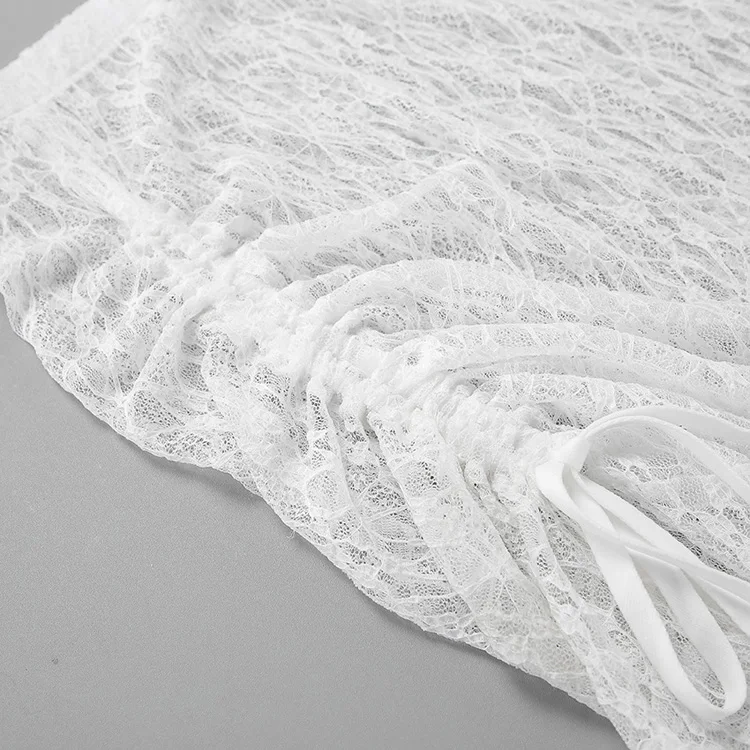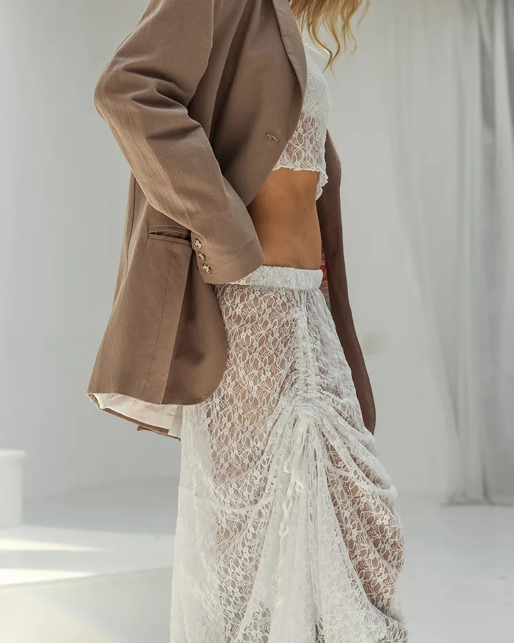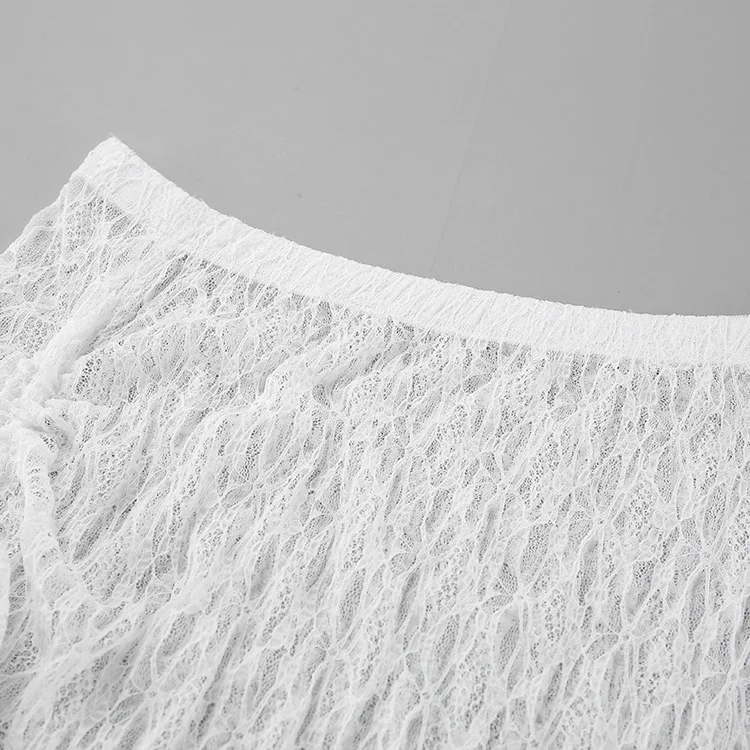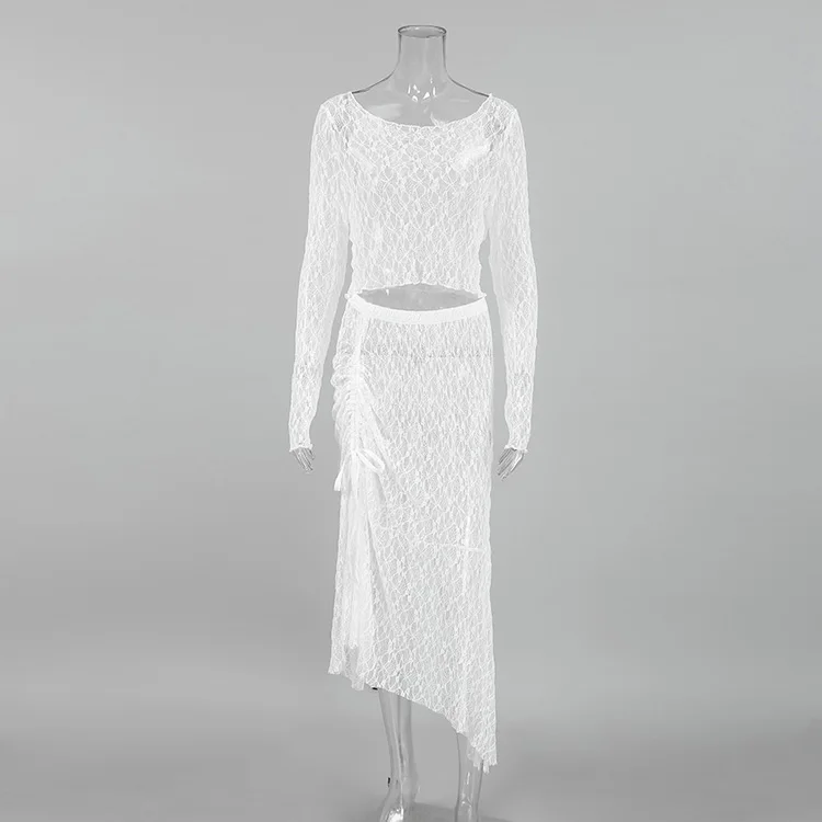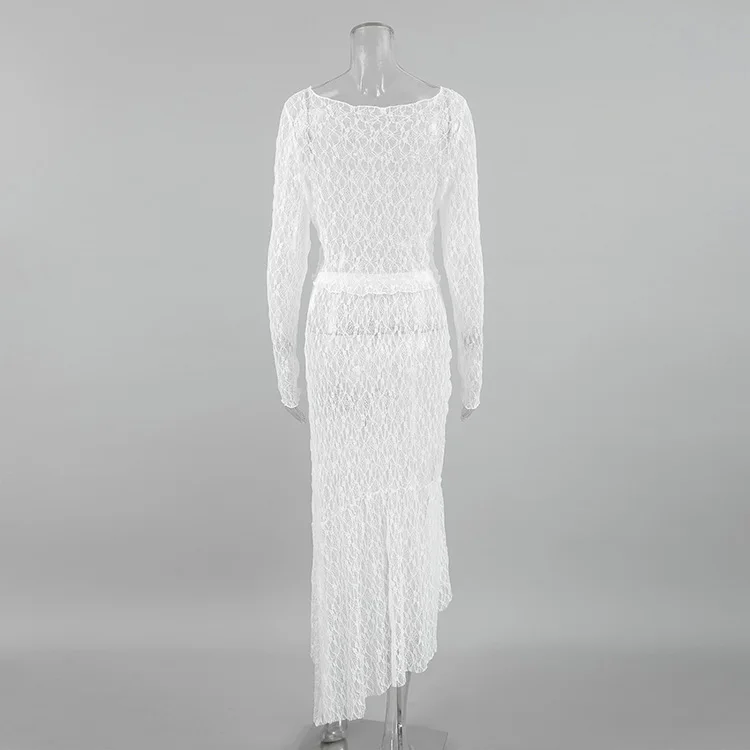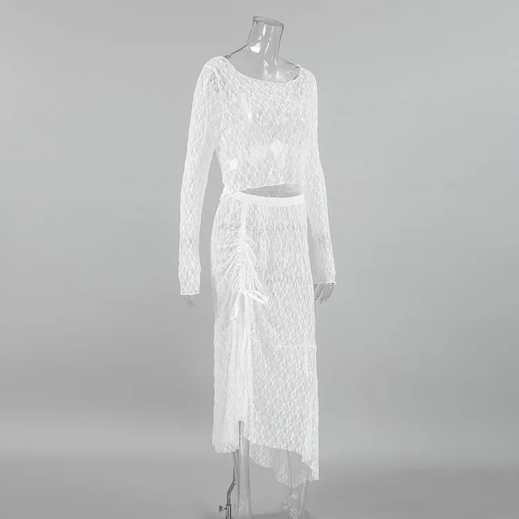 BKQU See-Through Cover Up Dress 2 Piece Set Women Summer Lace Mesh Sexy Long Sleeve Crop Tops Drawstring Midi Skirt Outfits 2025