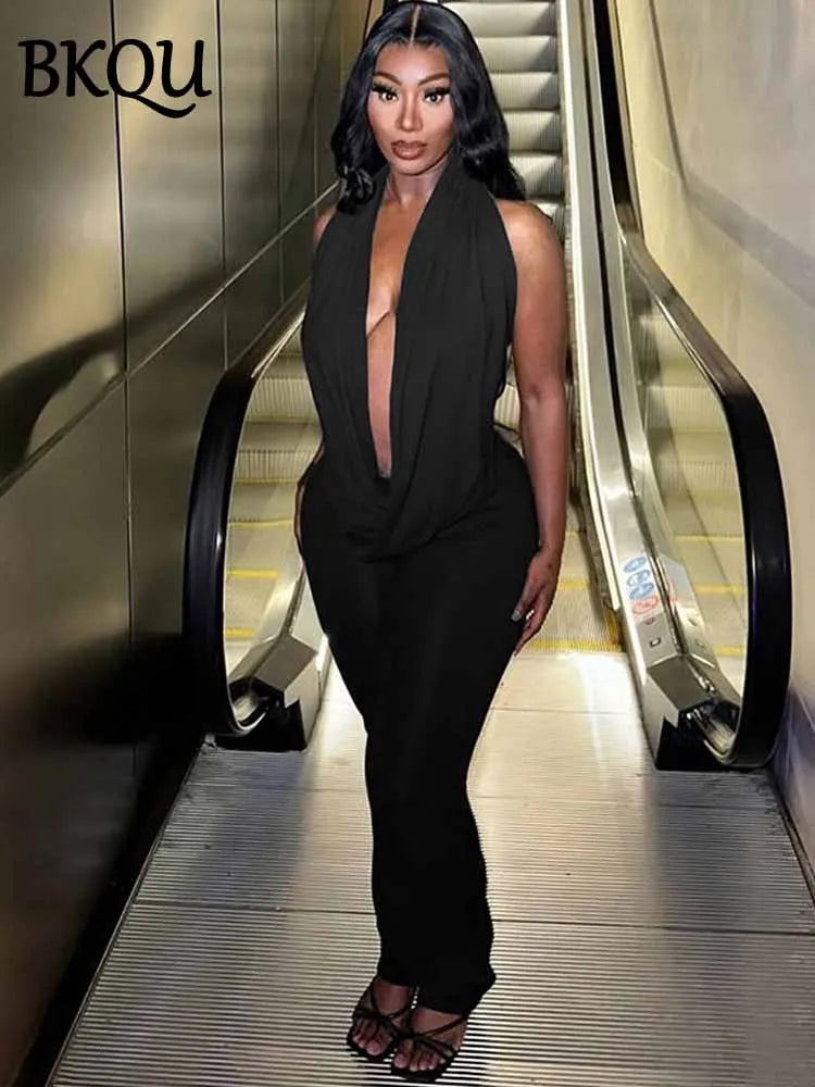 BKQU Sexy 2 Piece Sets Women Swinging Collar Halter Backless Tanks Top High Waist Leggings Midnight Club Elegant Street Outfits