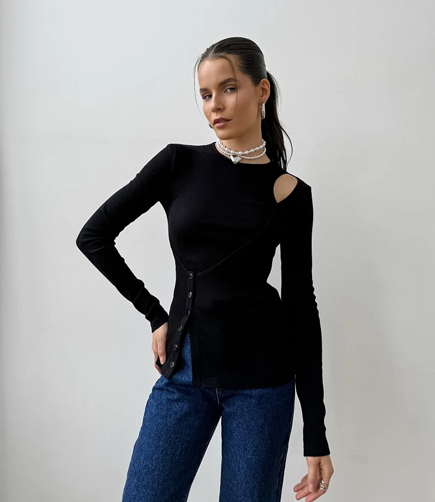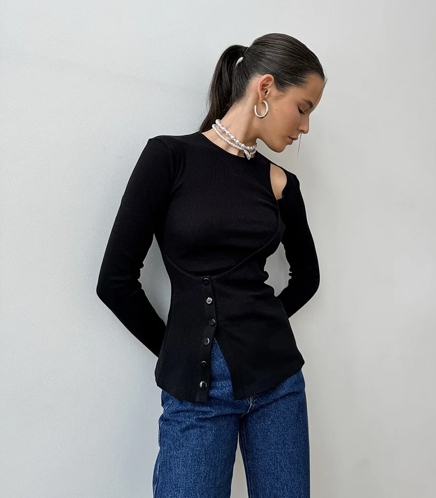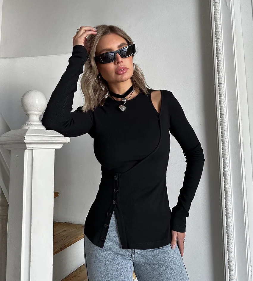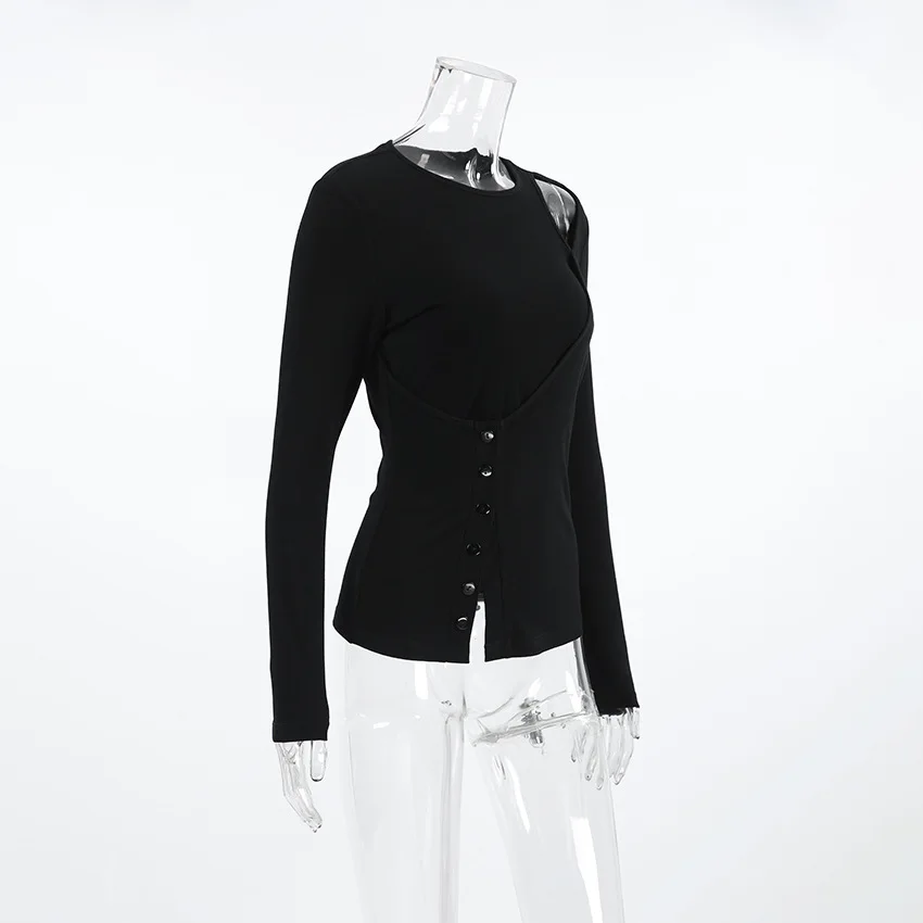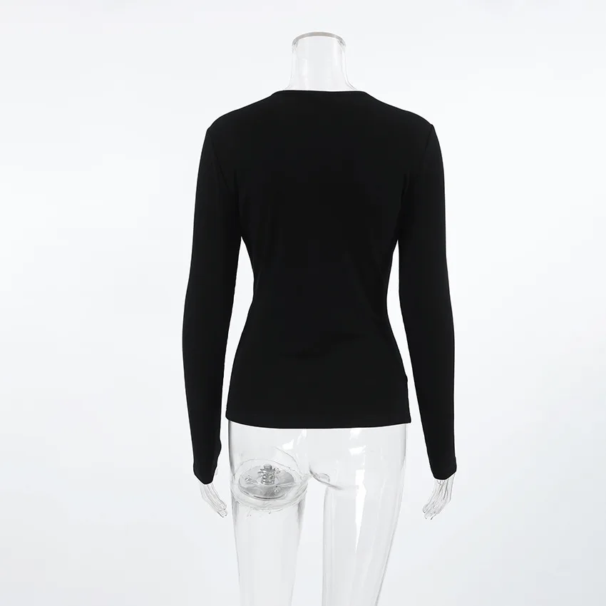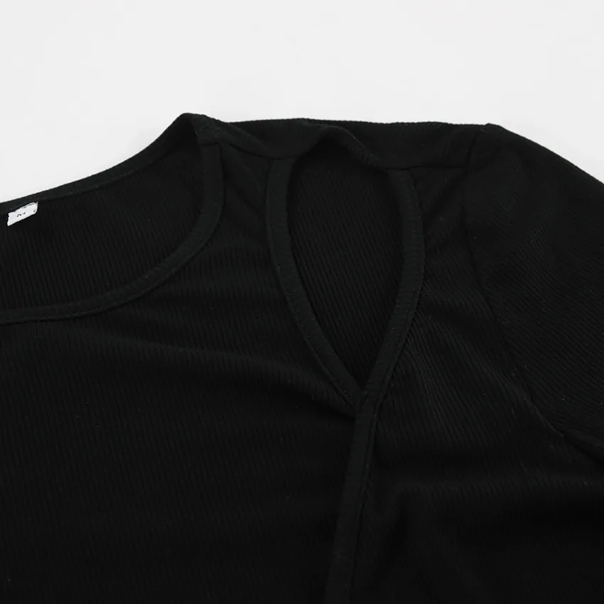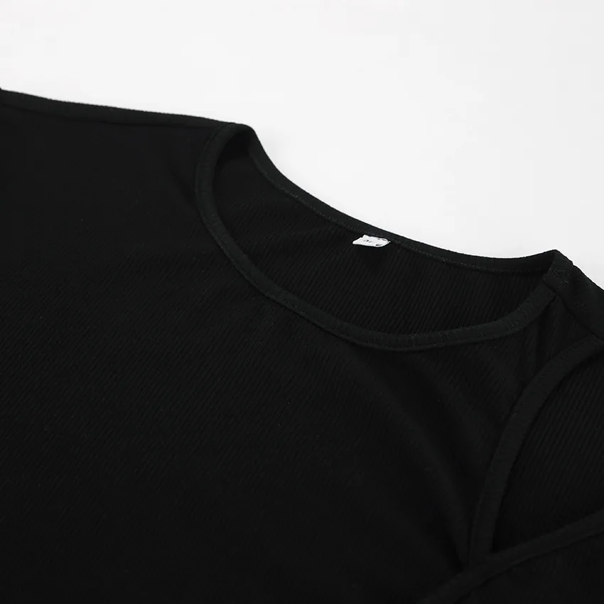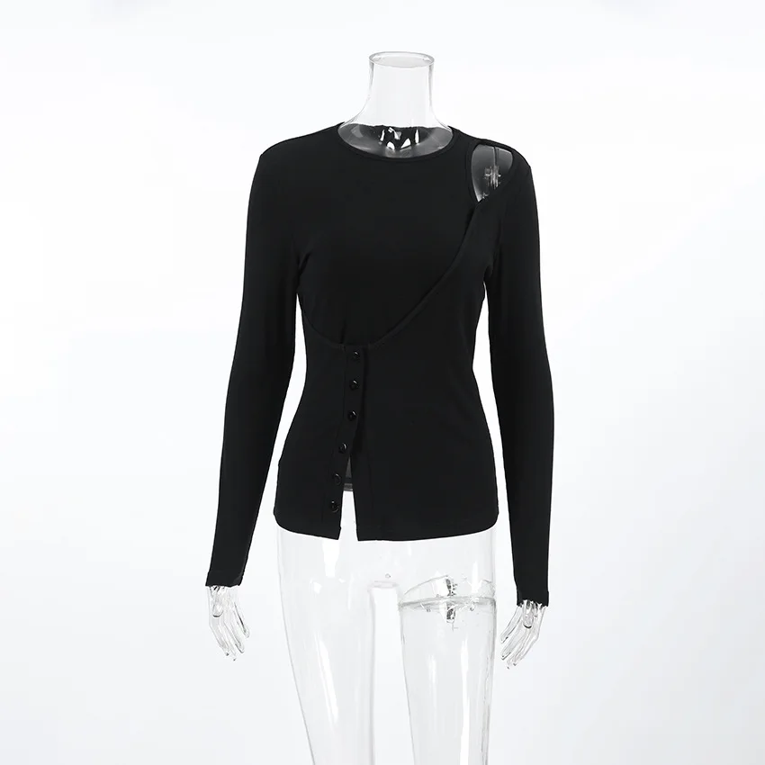 BKQU Sexy Hollow Out T Shirt Woman Black Long Sleeve Ribbed Tee Tops Autumn Casual Slim O Neck Button Streetwear T-shirt 2024
