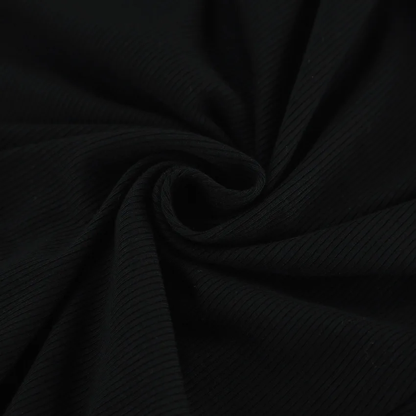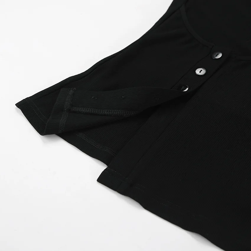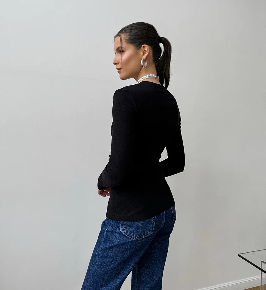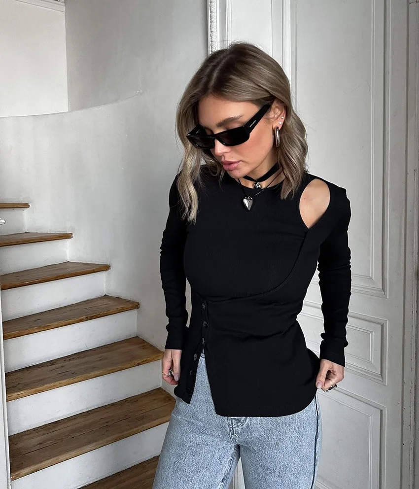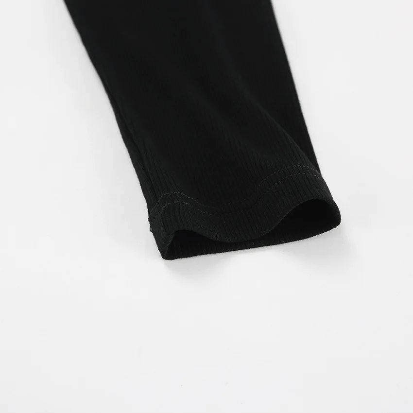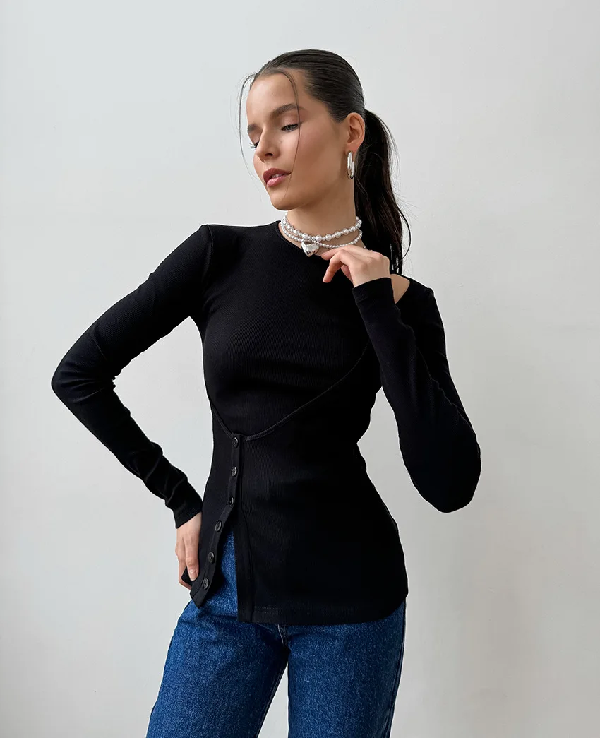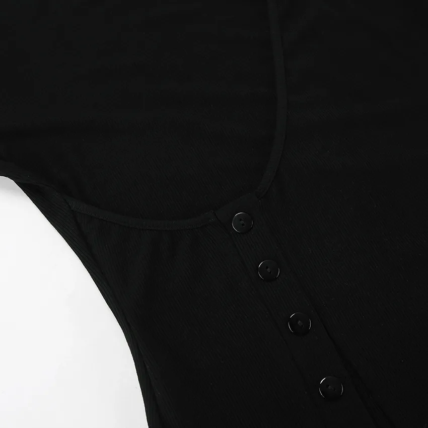 BKQU Sexy Hollow Out T Shirt Woman Black Long Sleeve Ribbed Tee Tops Autumn Casual Slim O Neck Button Streetwear T-shirt 2024