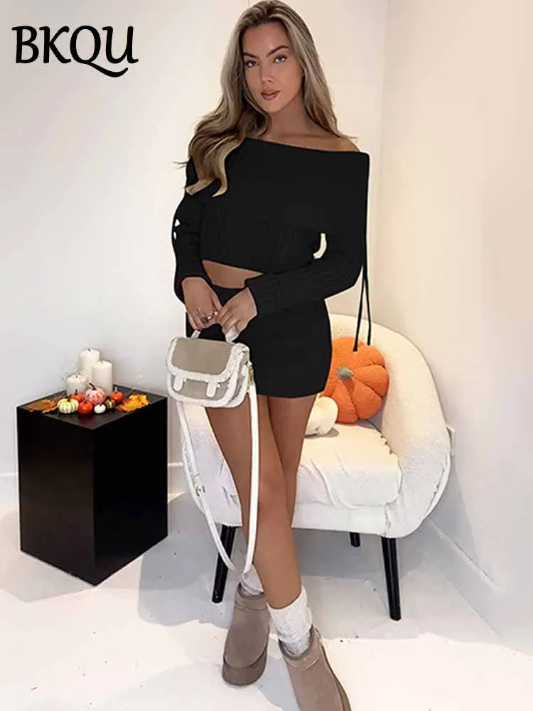 BKQU Sexy Off Shoulder 2 Piece Women Skirt Set Lace Up Long Sleeve Crop Top+Bodycon Mini Skirts Outfit Ladies Elegant Club Party