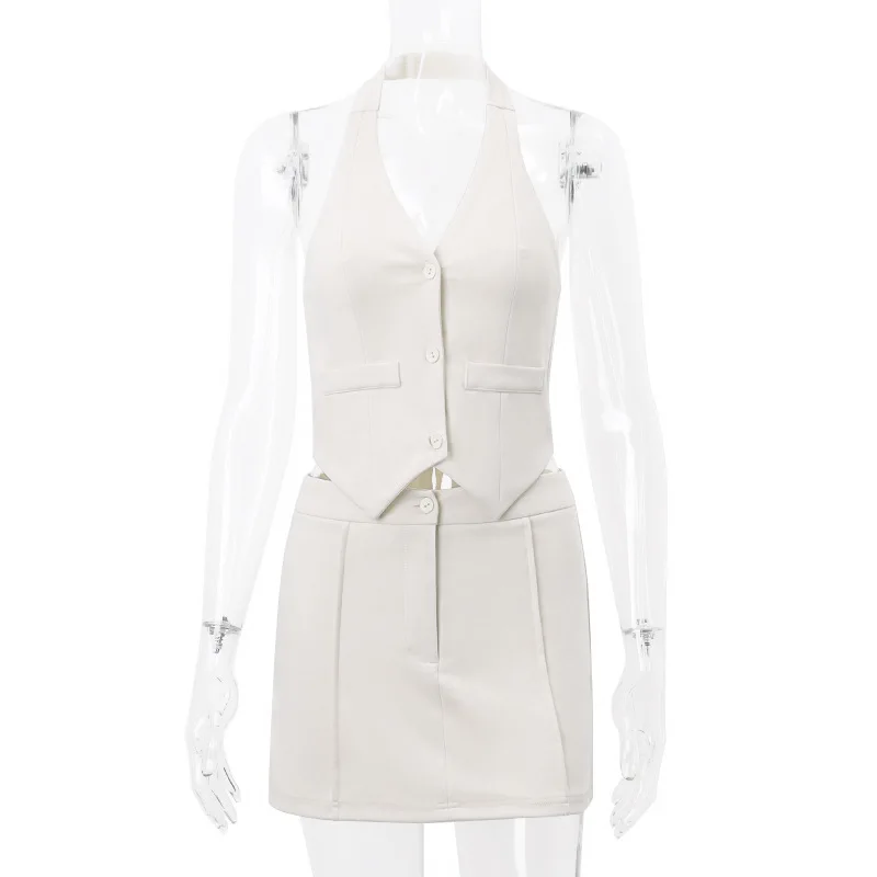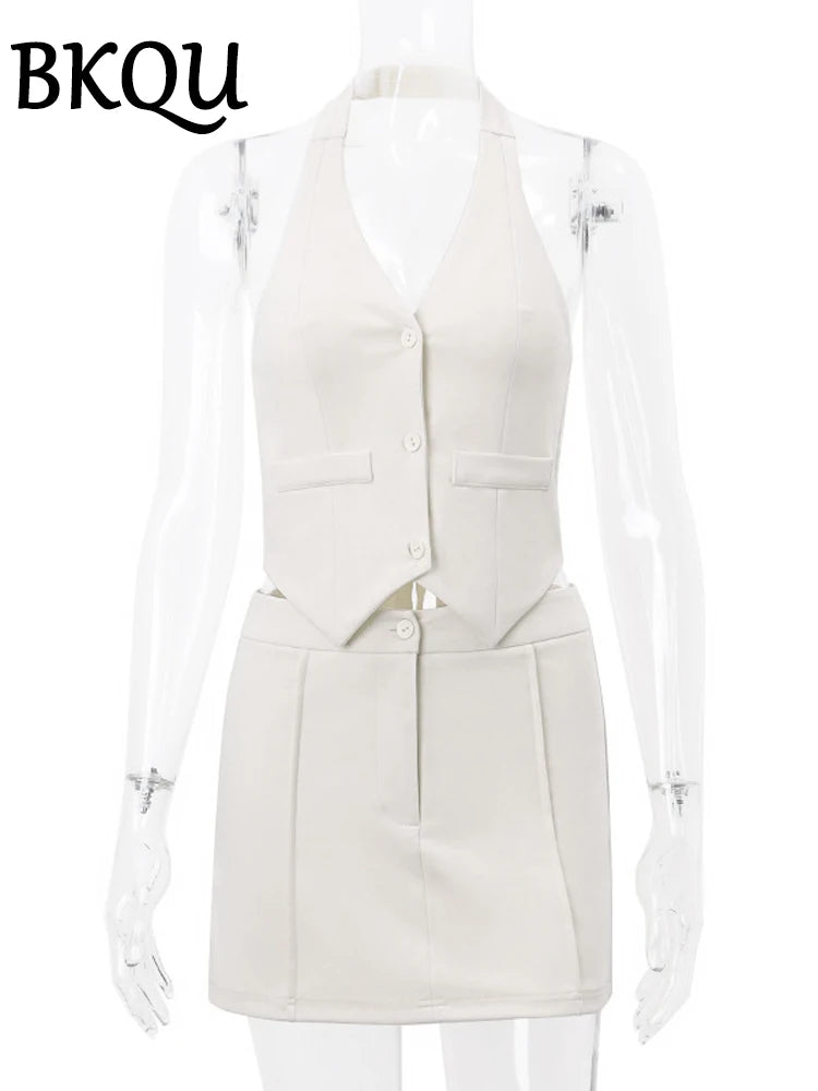 BKQU Sexy Skirts Two Piece Sets for Women Backless Halter Neck Single-breasted Tank Tops and Straight Mini Skirts Matching Suit
