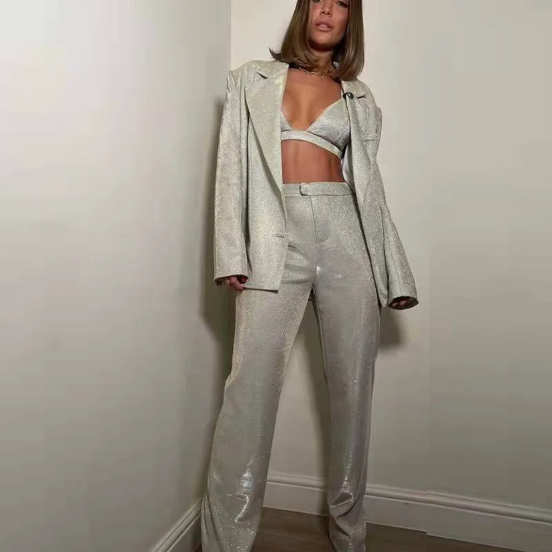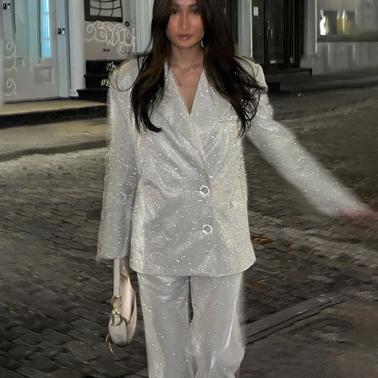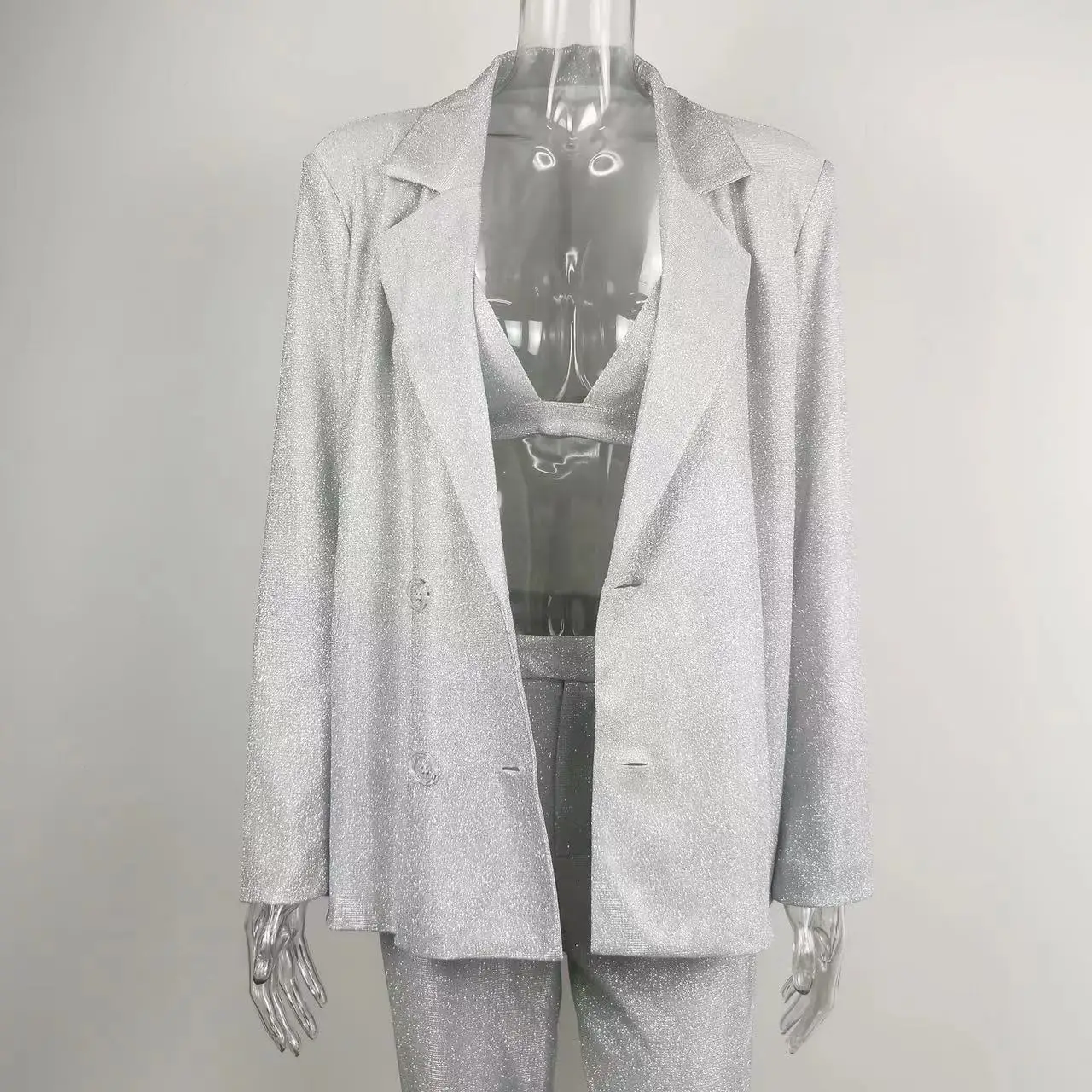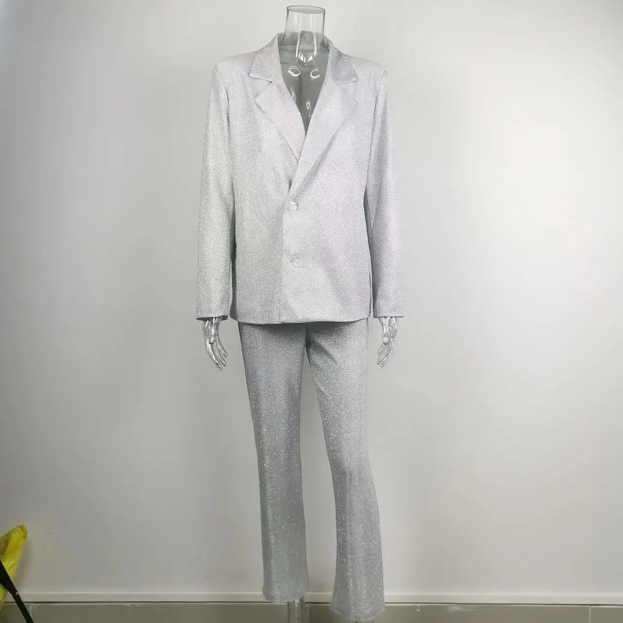 BKQU Shiny Silver Pants Set Women Party Club Blazer Two Piece Luxury Sets Femme Straight Pants and Glitter Blazers Matching Suit