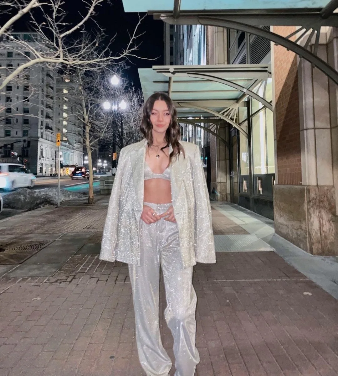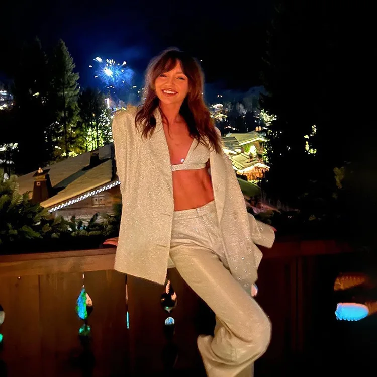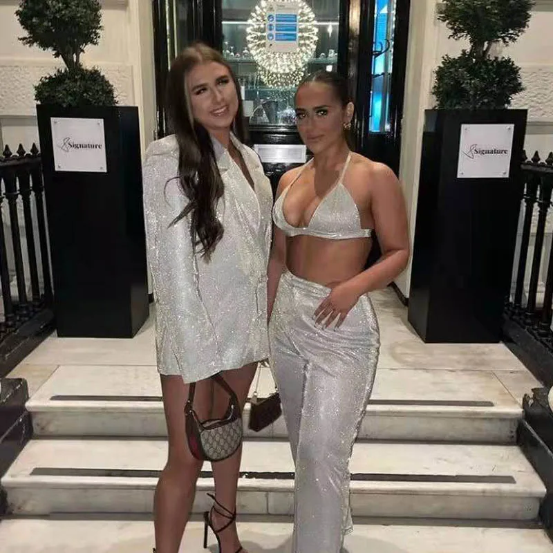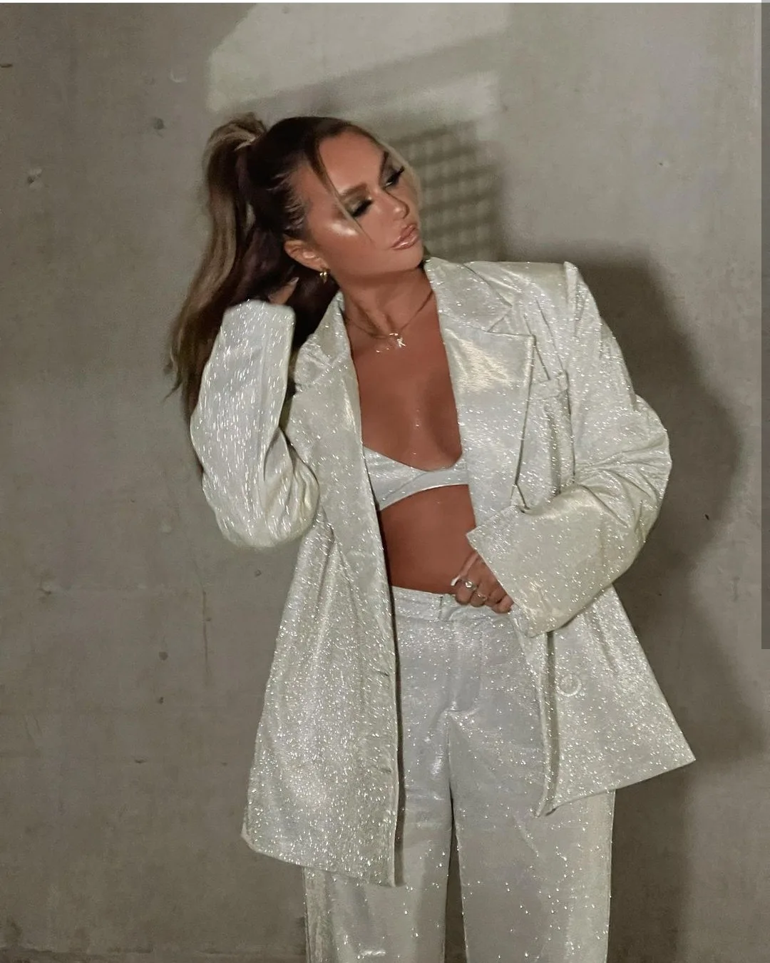 BKQU Shiny Silver Pants Set Women Party Club Blazer Two Piece Luxury Sets Femme Straight Pants and Glitter Blazers Matching Suit