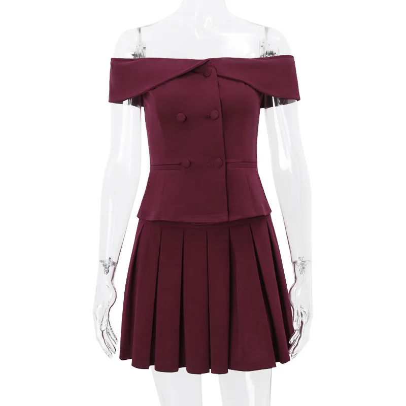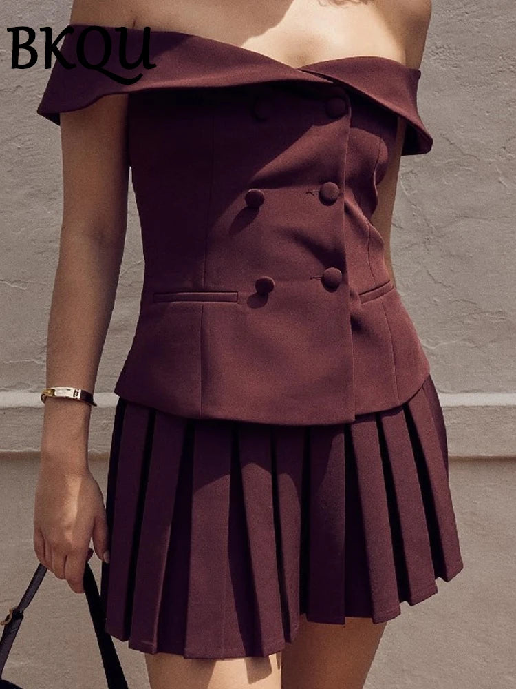 BKQU Skirts Set for Women Elegant Double Breasted Strapless Corset Tank Tops and Pleated Mini Skirts Two Piece Sets Party Club