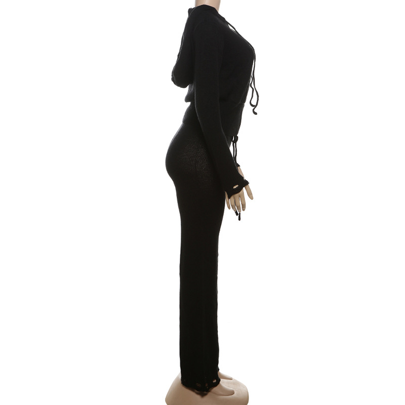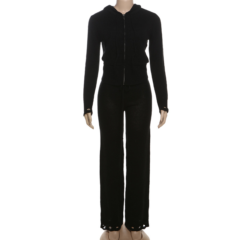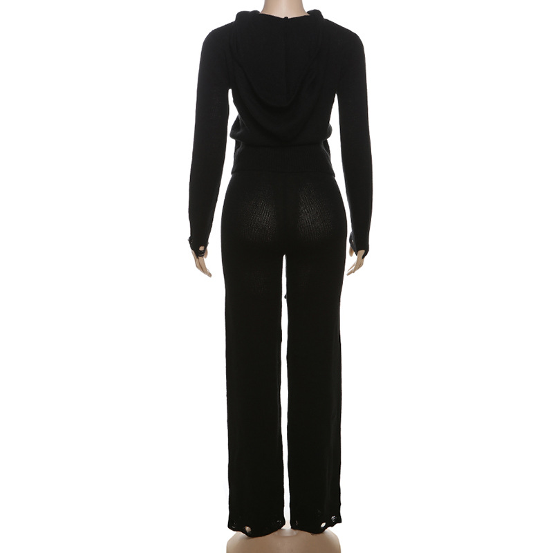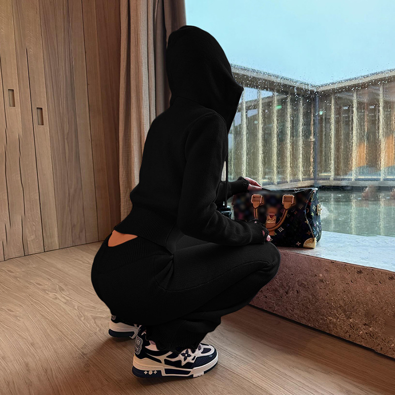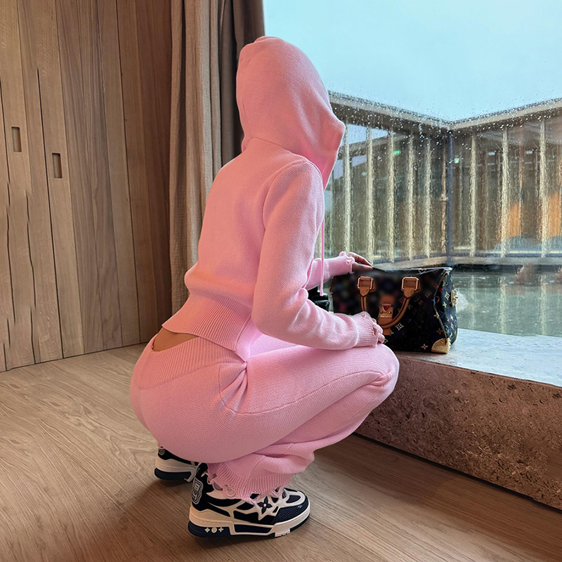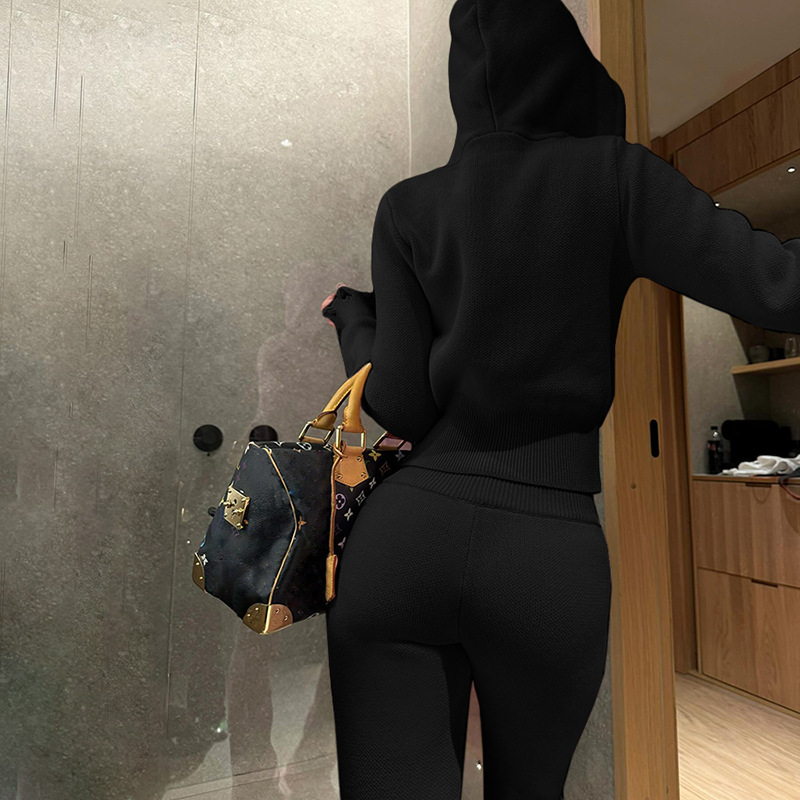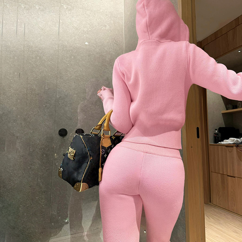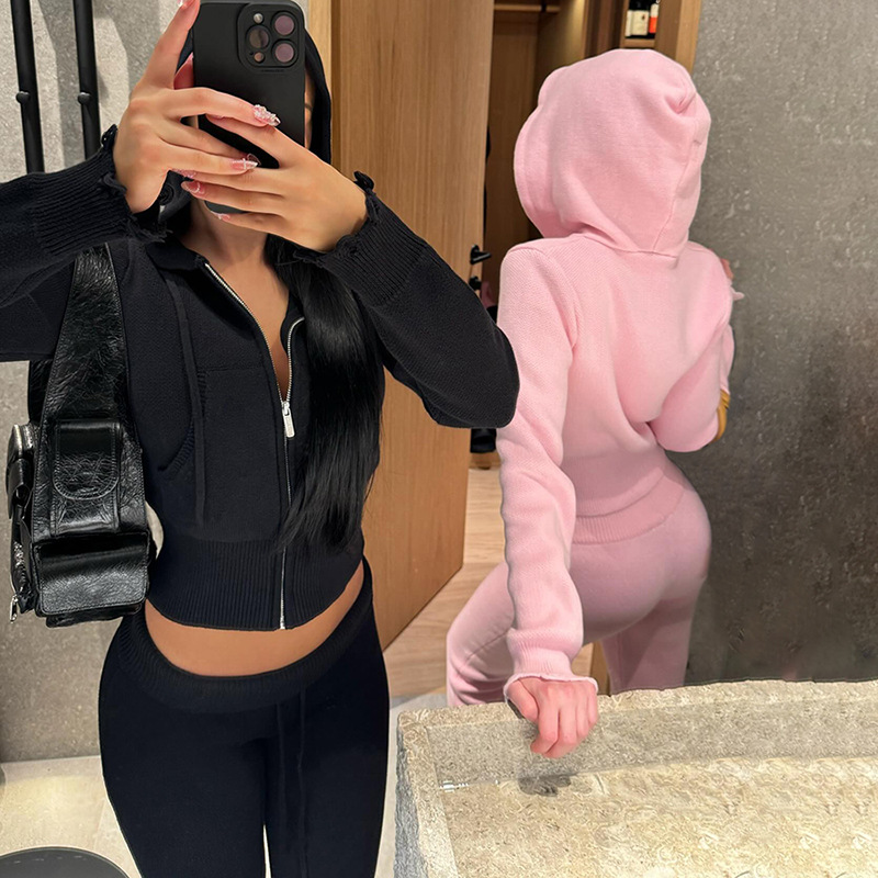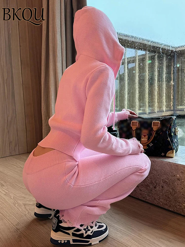 BKQU Solid Tracksuit Women Knitted 2 Piece Sets Casual Hooded Zip Jacket+Drawstring Pants Sporty Matching Streetwear Outfit 2024