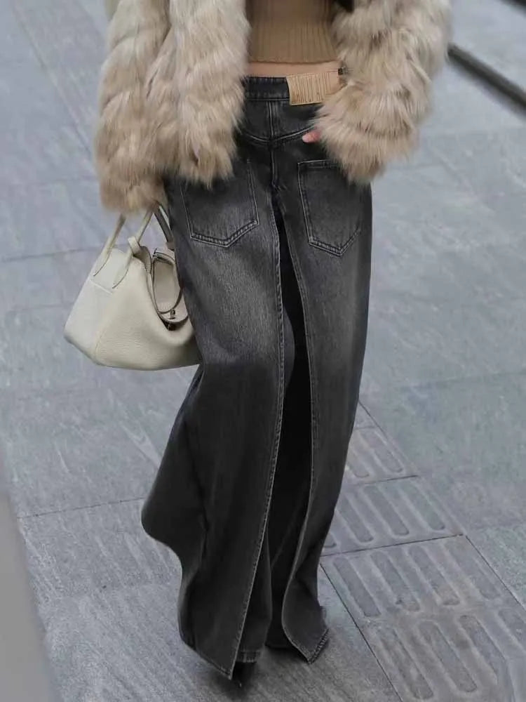 BKQU Spliced Design Jeans Women Hip Hop Baggy Wide Leg Denim Pants Trendy Vintage High Waist Fake Two-piece Jeans Trousers Y2K