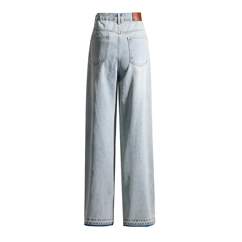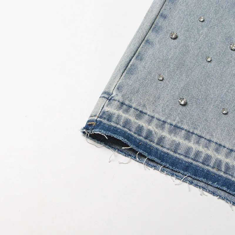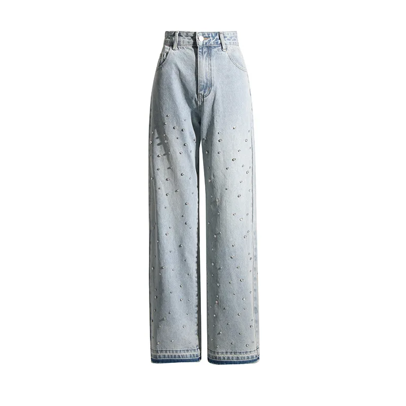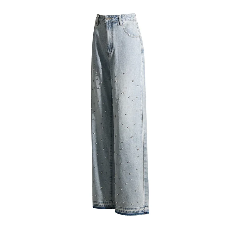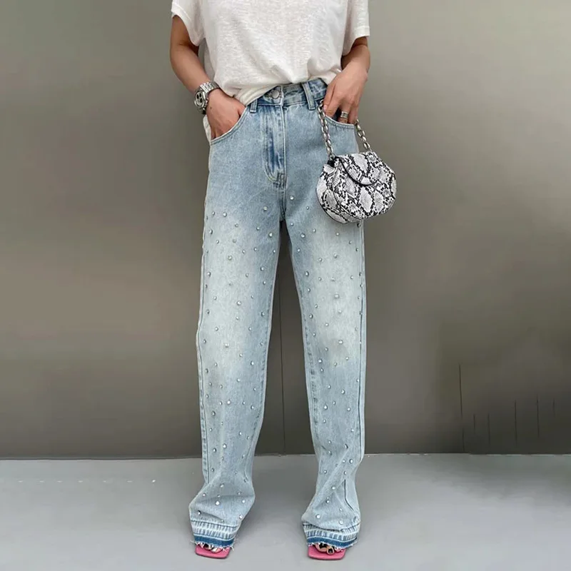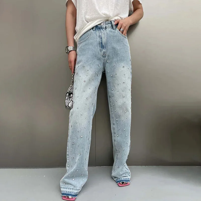 BKQU Straight Baggy Jeans Women High Waist Wide Leg Rhinestones Denim Long Pants 2023 Fashion Streetwear Diamonds Shinny Trouser