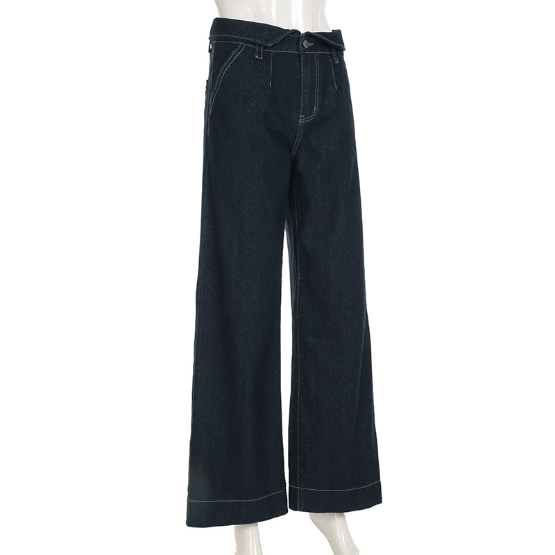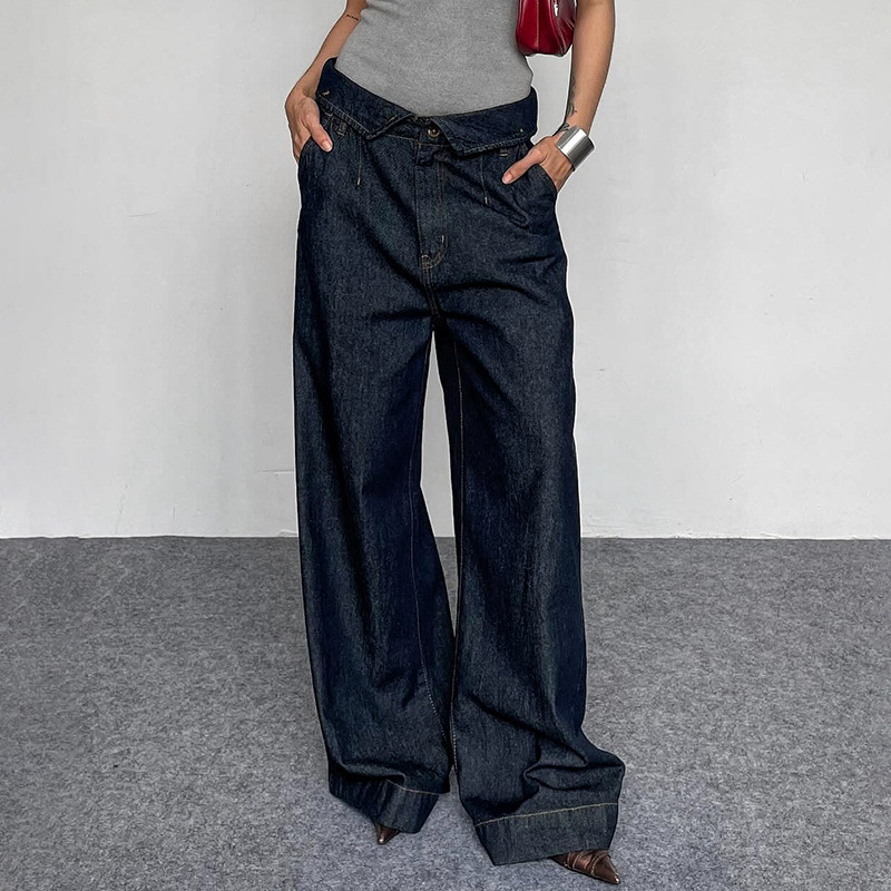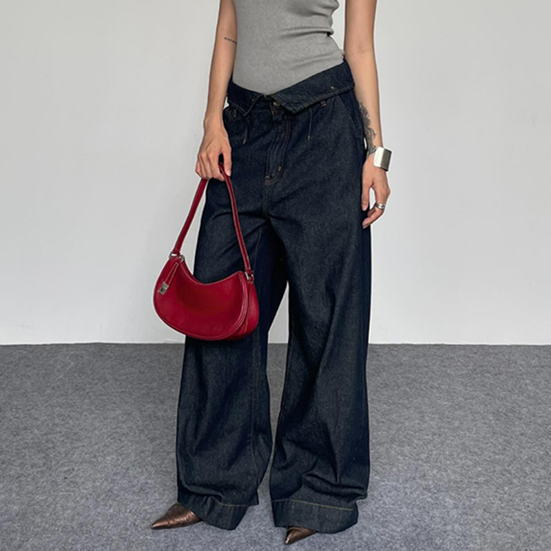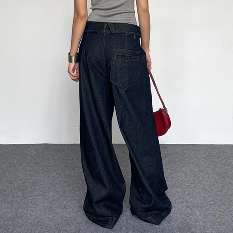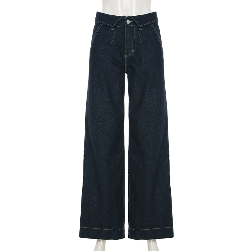 BKQU Straight Jeans Women Streetwear Y2k Fold High Waist Baggy Casual Wide Leg Harajuku Denim Trouser Vintage Grunge Jeans Pants