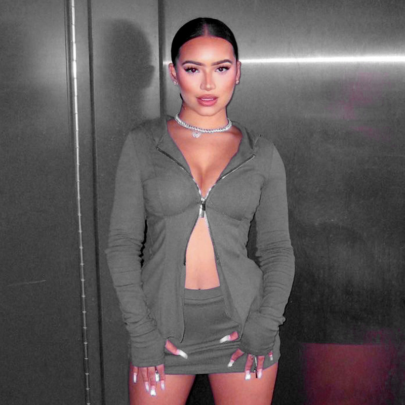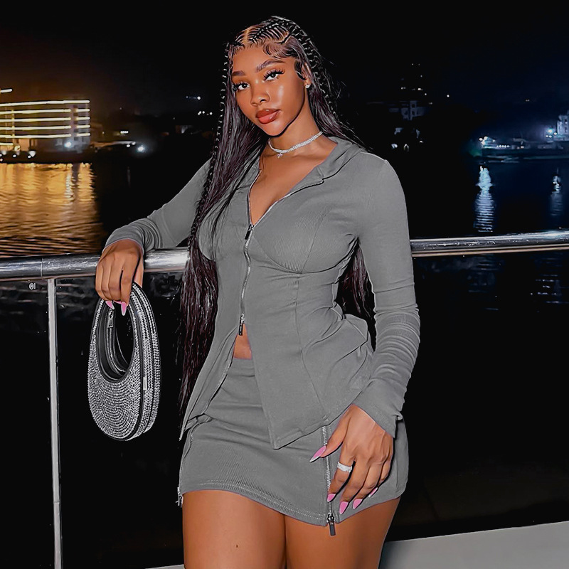 BKQU Stretch Women Tracksuit 2 Piece Set Ribber Zipper Long Sleeve Hoodie+Wrap Hip Split Mini Skirts Outfits Female Streetwear