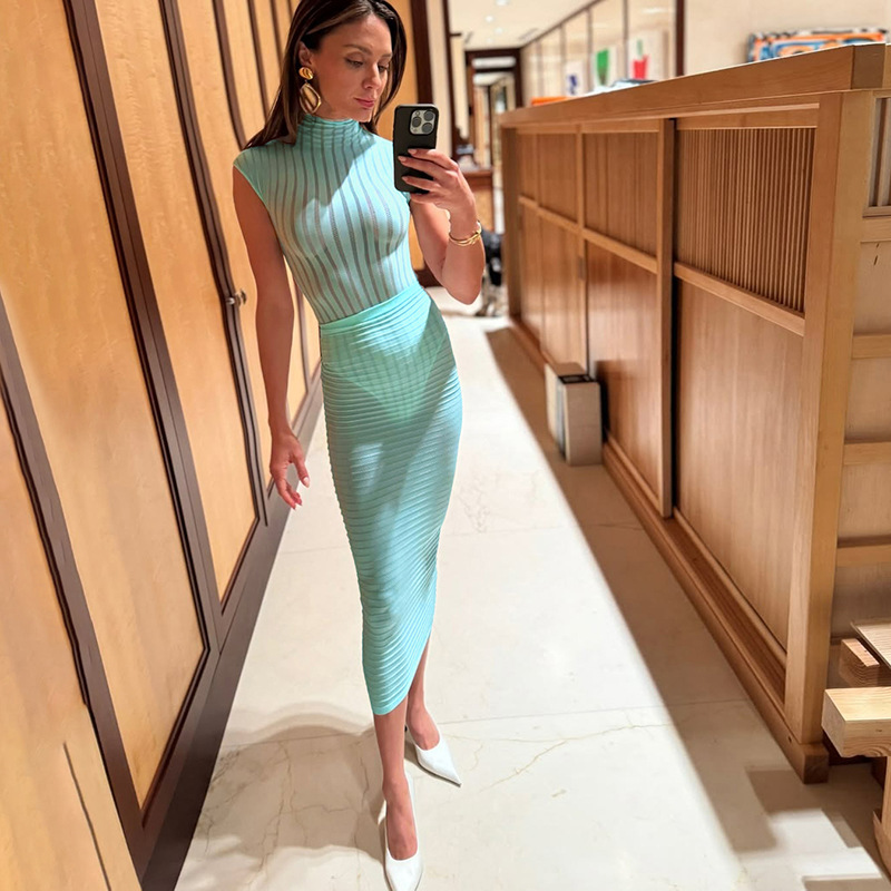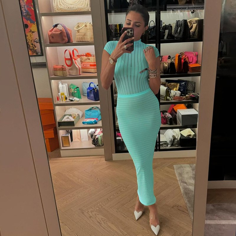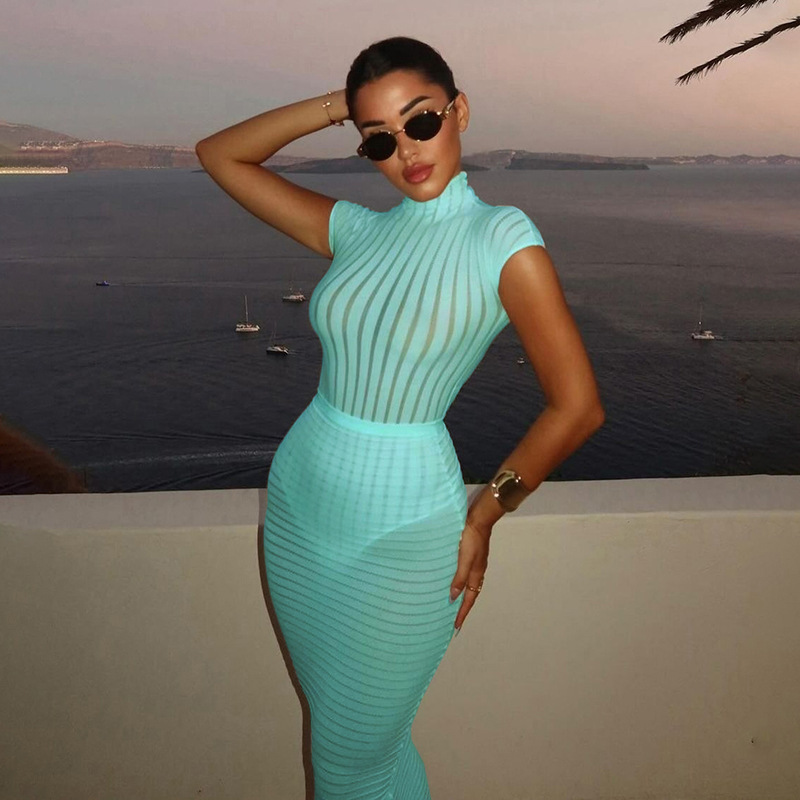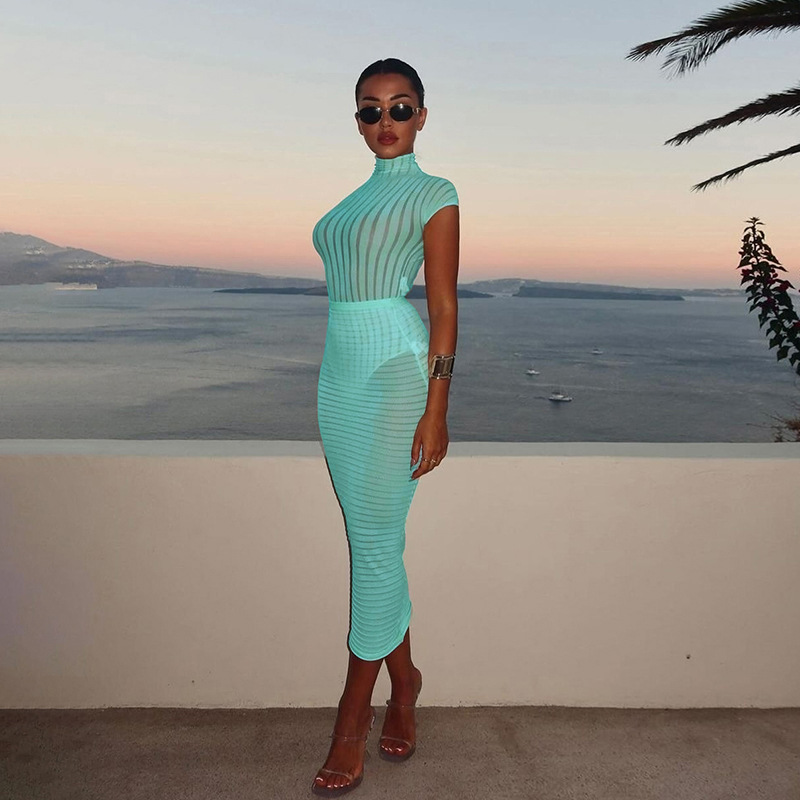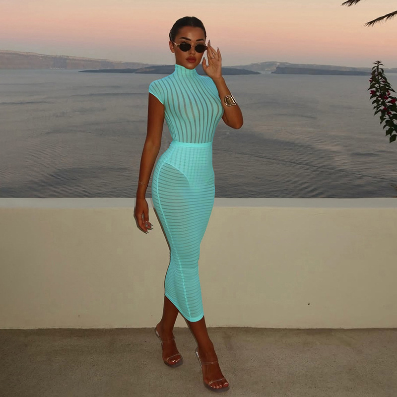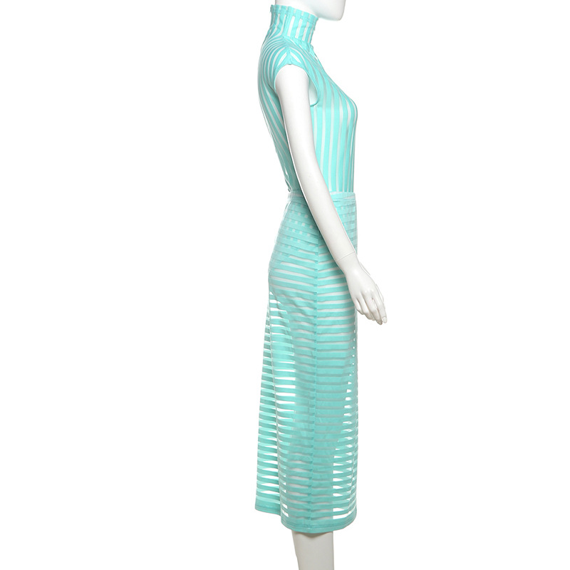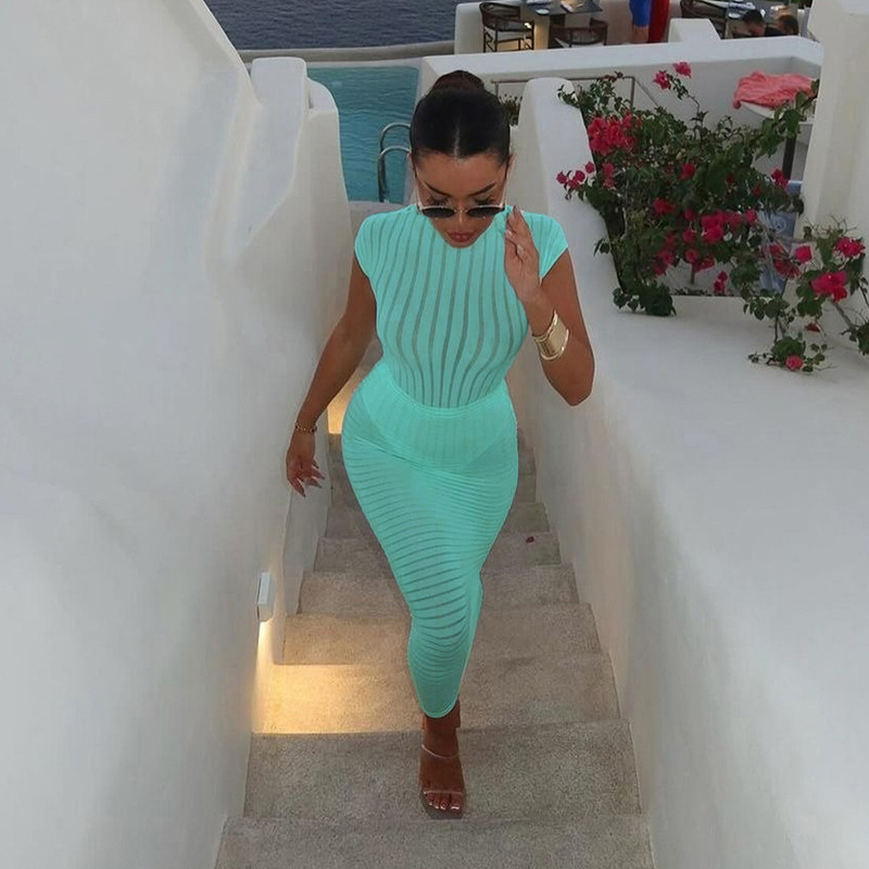 BKQU Stripe Women Sexy Matching 2 Piece Set Summer Short Sleeve Bodysuit Tops Elegant Slim Long Skirt See Through Vacation Suits