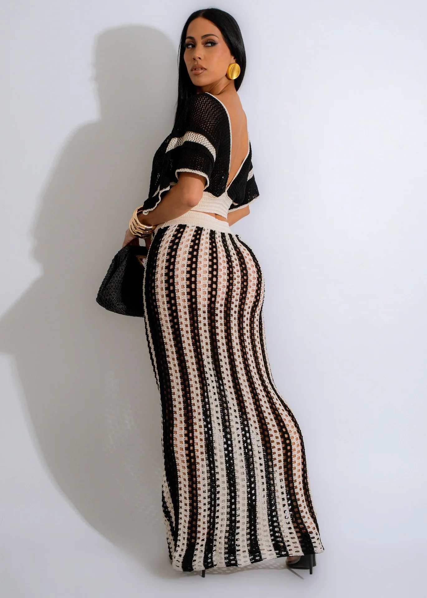 BKQU Striped Knitted Dress Sets Hollow Out Long Skirts With V-Neck Short Sleeve Crop Tops for Women 2024 Summer Vacation Outfits