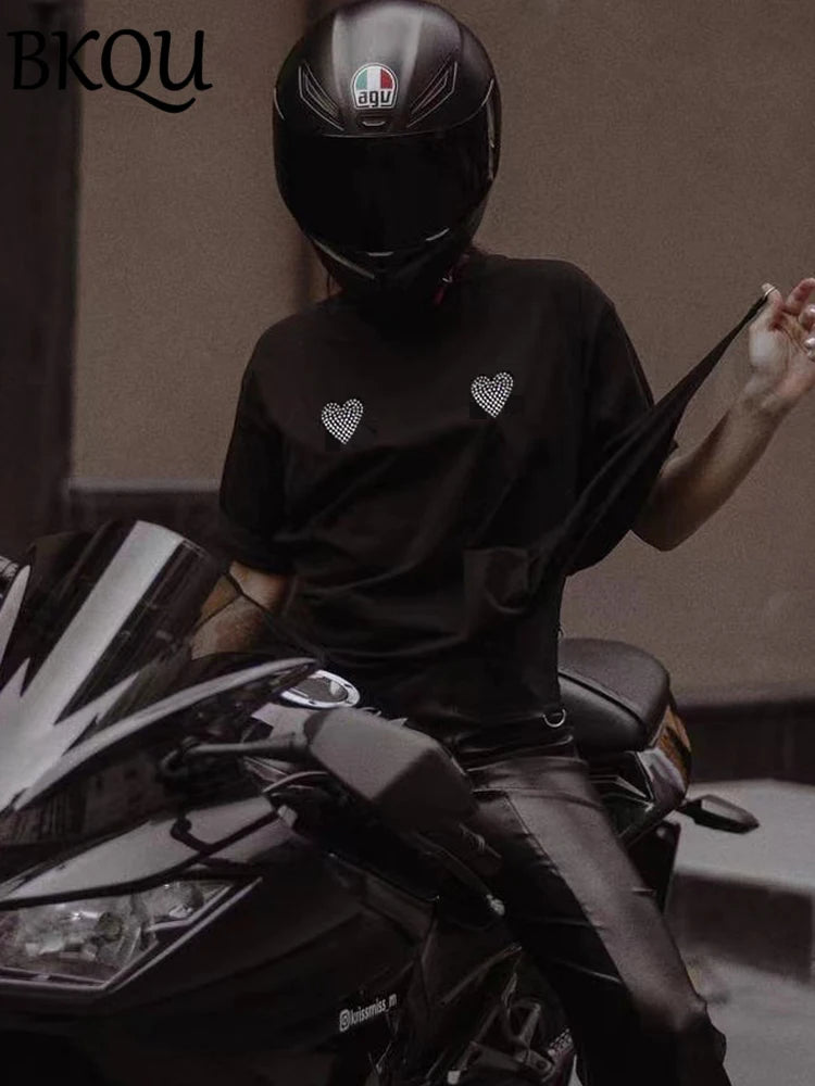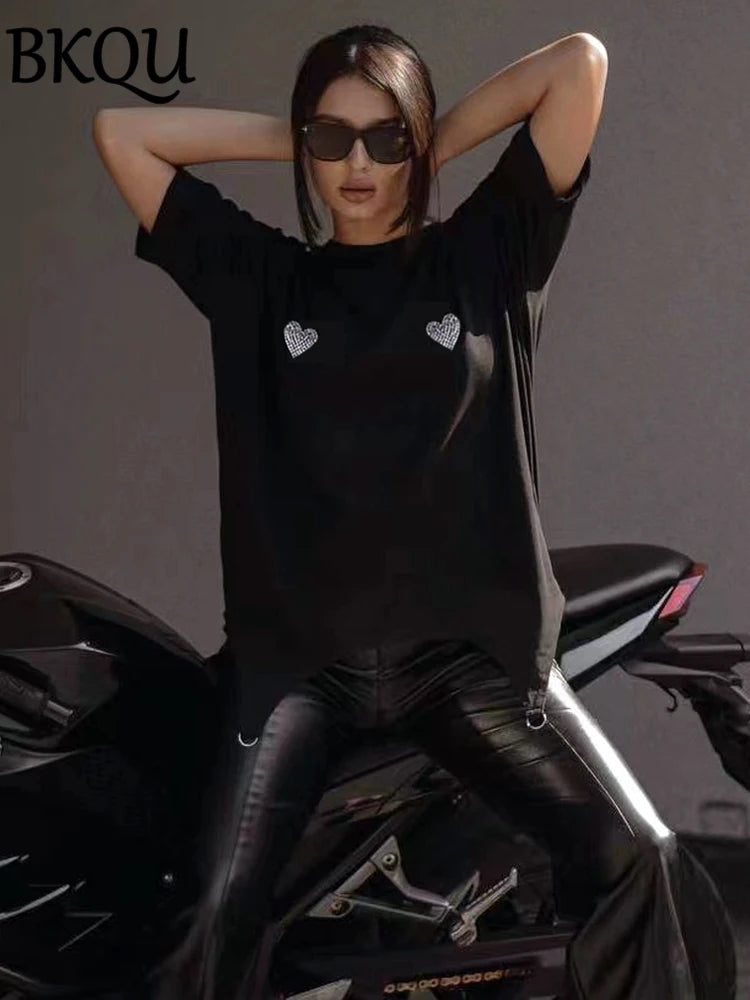 BKQU Summer Hot Diamond T Shirt Women Loose Streetwear Printed Short Sleeve Fashion Rhinestone O-neck Cotton Oversize Tees Tops