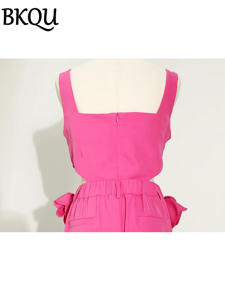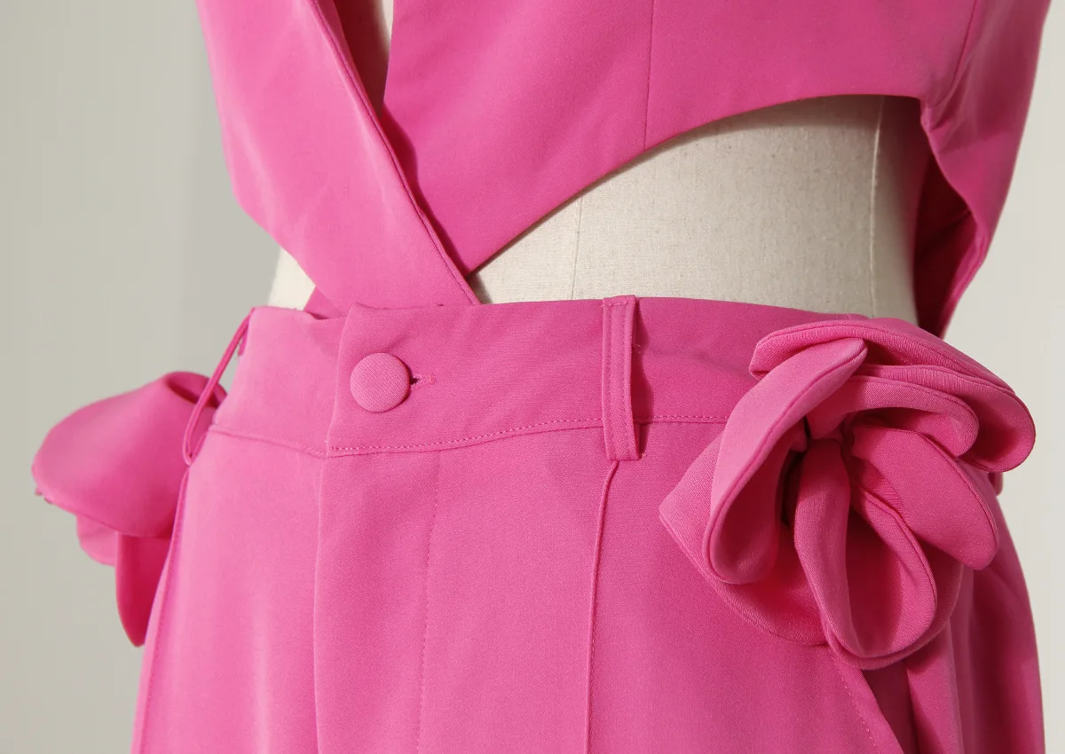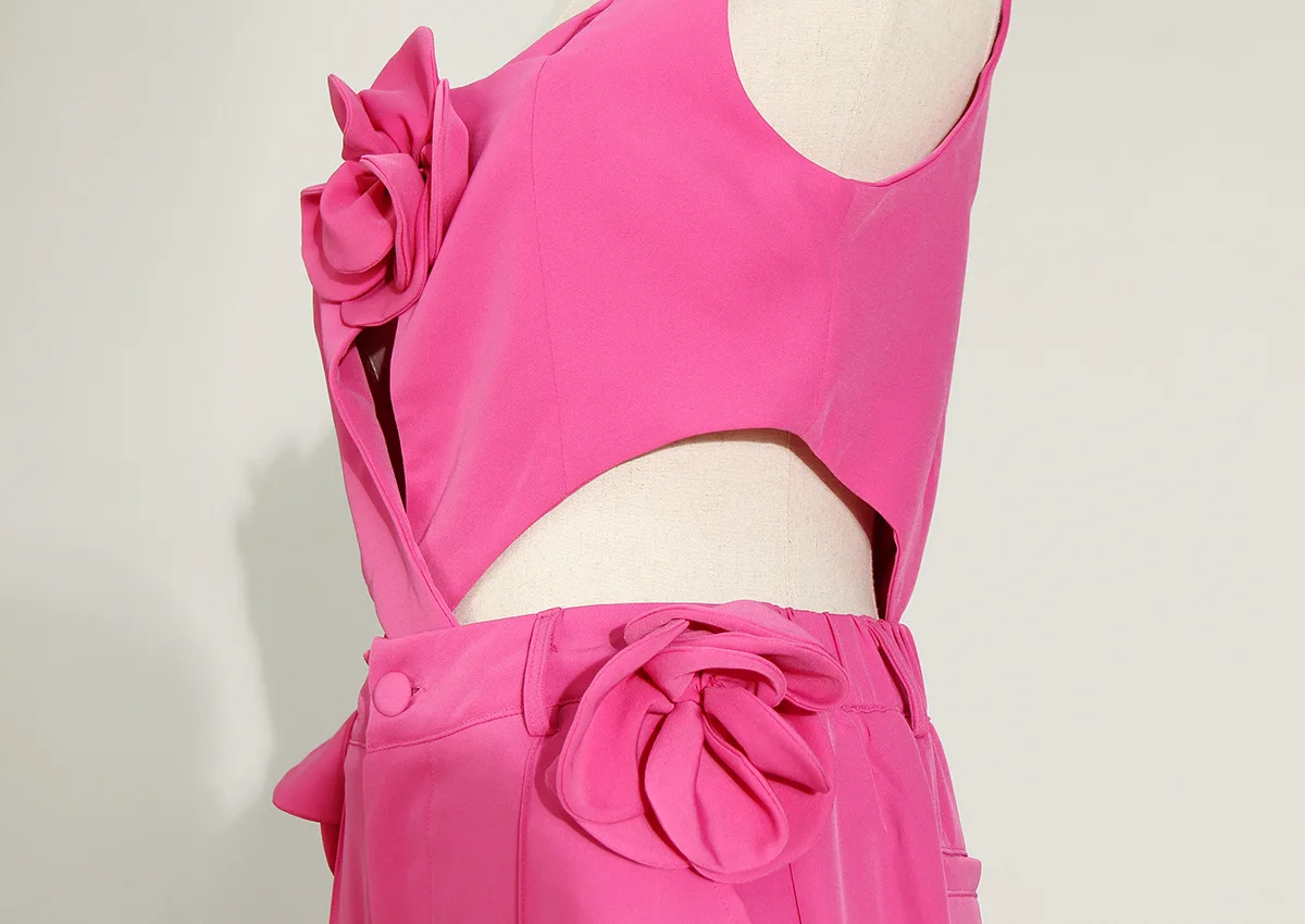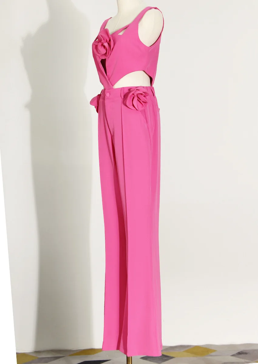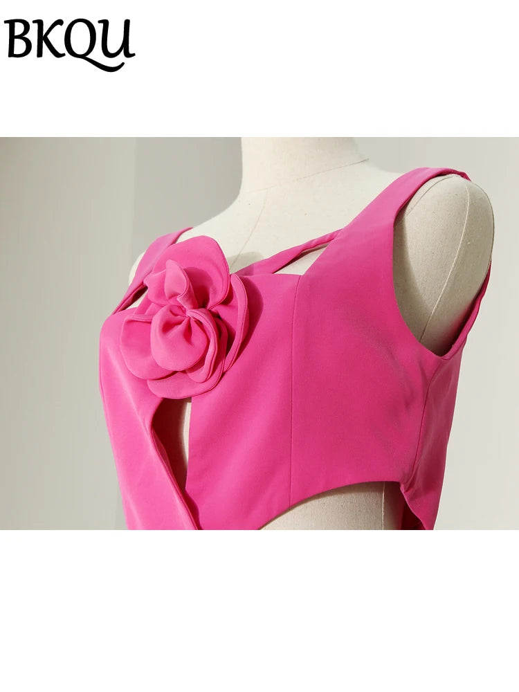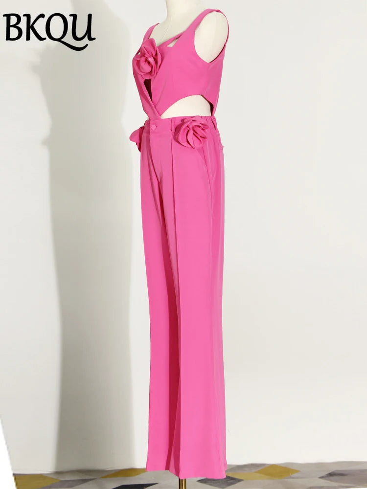 BKQU Trendy Pants Two Pieces Set Women 3D Floral Sexy Hollow Out Vest High Waist Flare Trousers Sets Elegant Lady Party Outfits