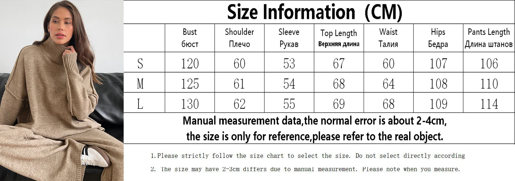 BKQU Turtleneck Sweater Knitted Pants Suits Women Autumn Winter Loose Casual Split Top And Wide Leg Trousers Warm Two Piece Set