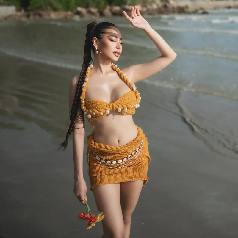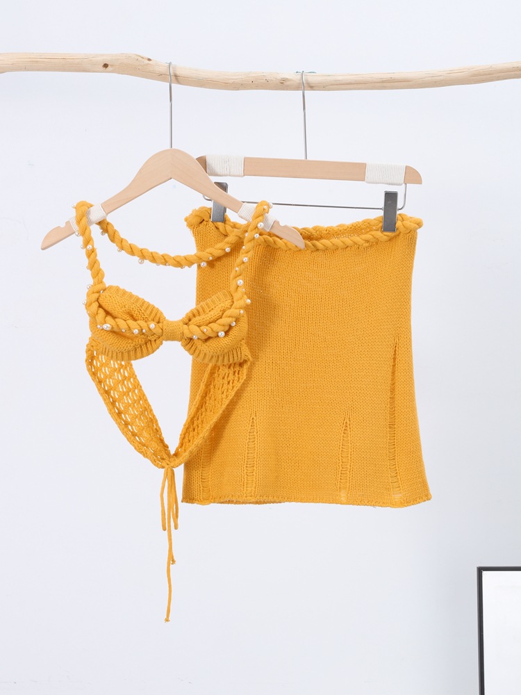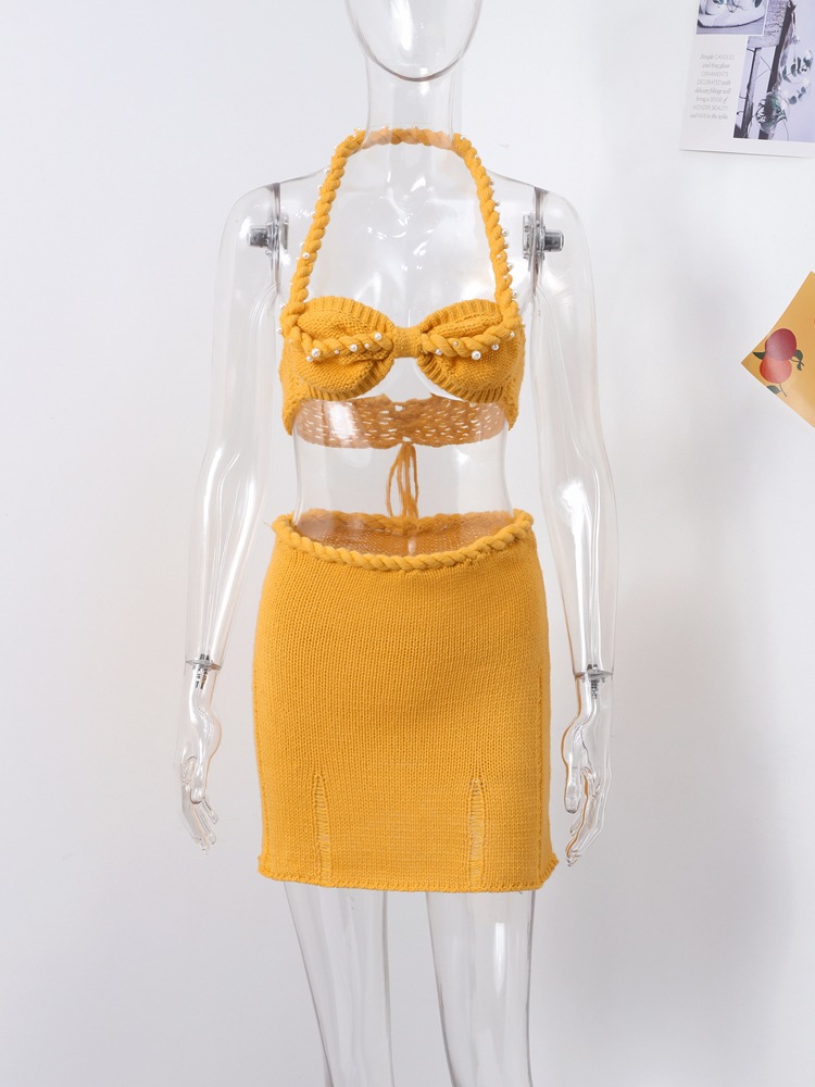 BKQU Twist Sexy Knitted Two Piece Set Women Fashion Pearls Decoration Halter Bikini Tops Mini Skirt Lady Beach Vacation Outfits
