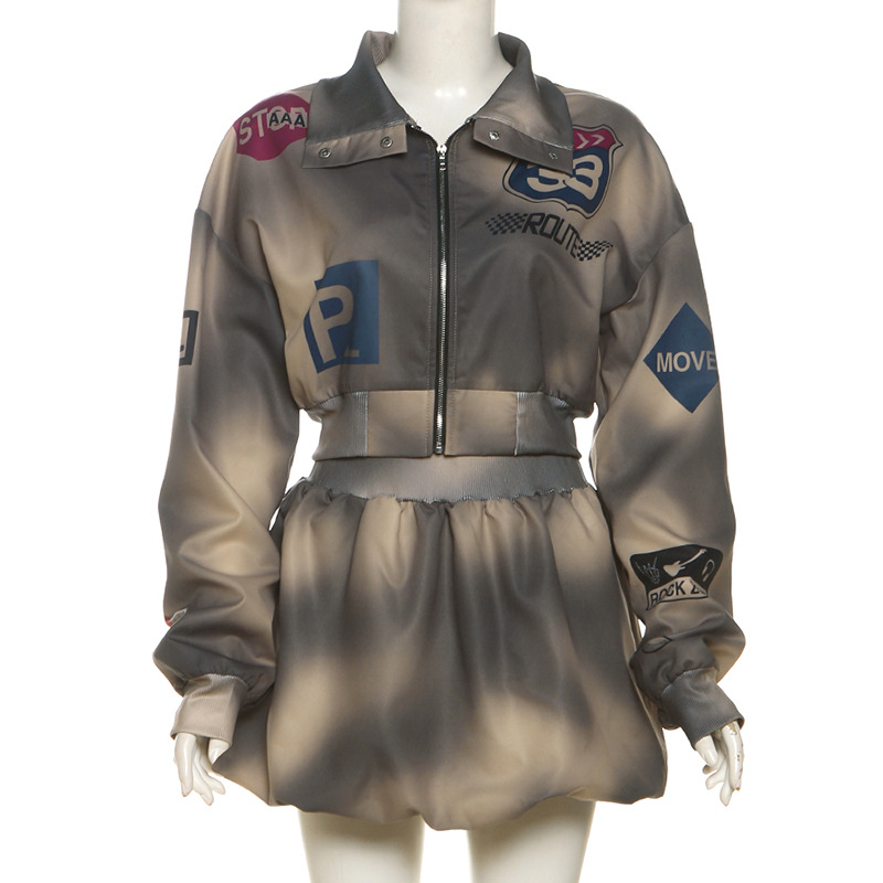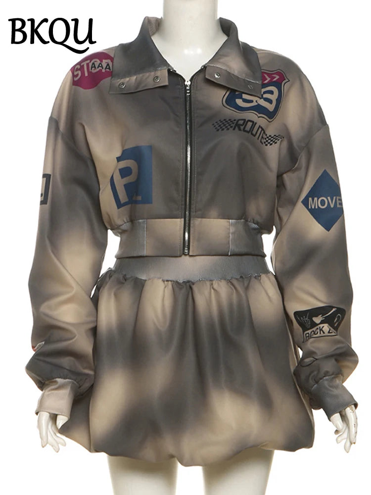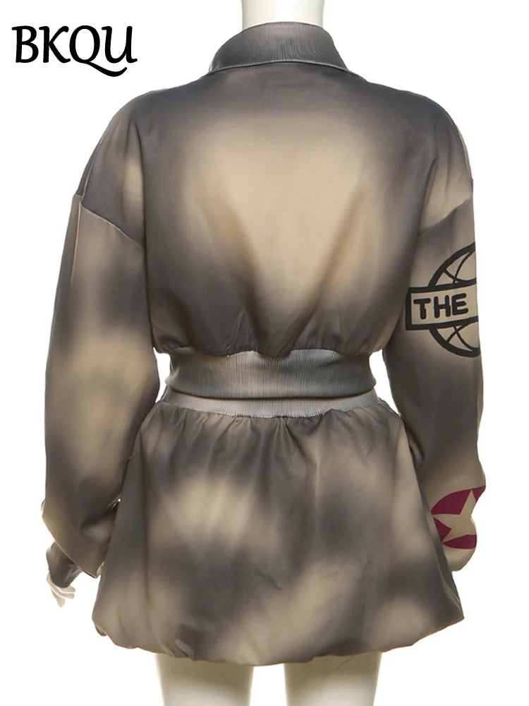 BKQU Vintage Tie Dye 2 Piece Set Women Letter Print Zip Crop Jacket and Puffy Mini Skirt Outfits Fashion Matching Y2K Streetwear