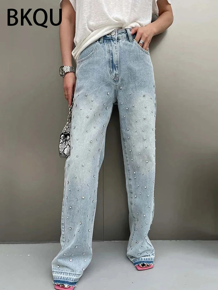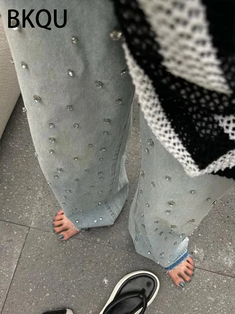 BKQU Wide Leg Straight Jeans for Women 2024 Korean Rhinestones Design Blue High Waist Baggy Pants Female Diamonds Shinny Trouser