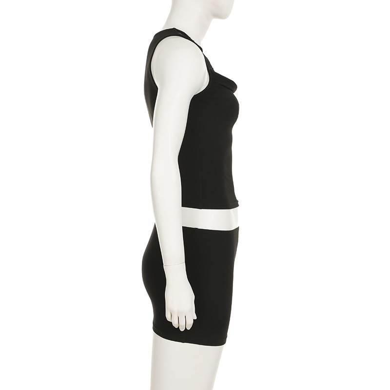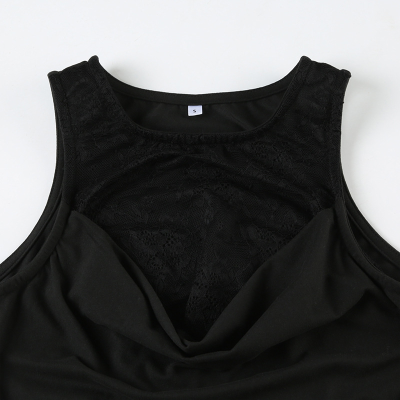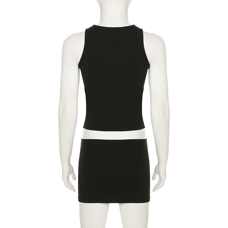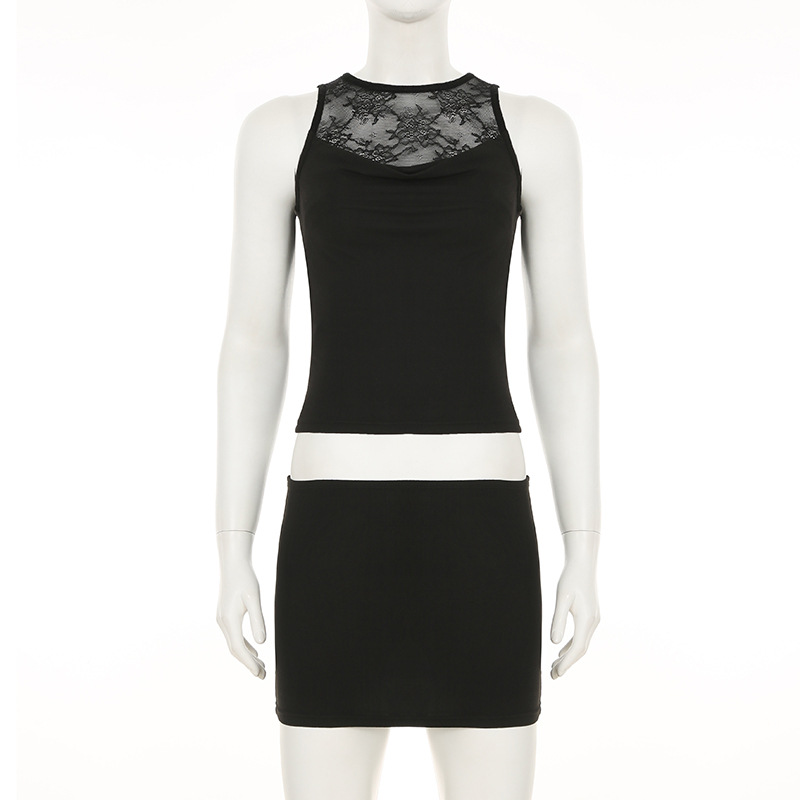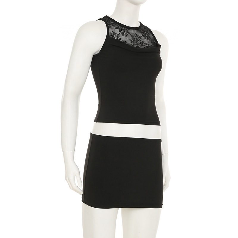 BKQU Women 2 Piece Bodycon Skirt Set Lace Patchwork Sleeveless Tank Top And Hip Wrap Mini Skirts 2025 Chic All-matching Outfits