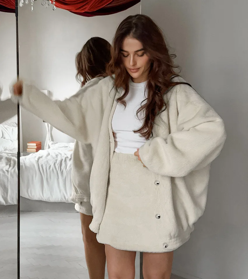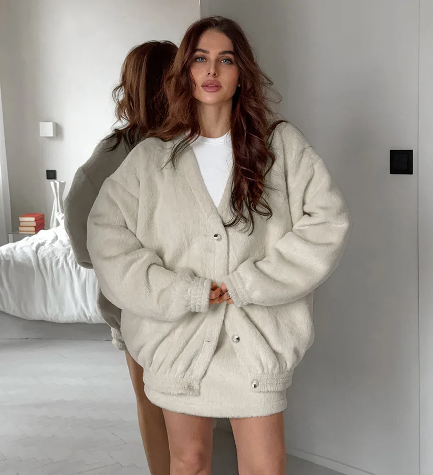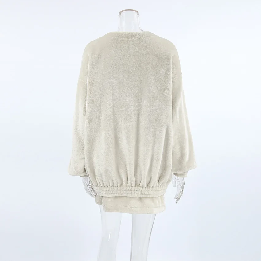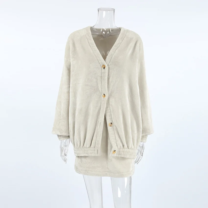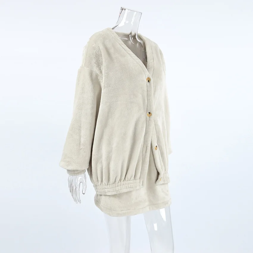 BKQU Women Fleece Skirts Suit Loose V-Neck Cardigan Sweater And Mini Skirt Two Pieces Set Casual Warm 2024 Autumn Winter Outfits