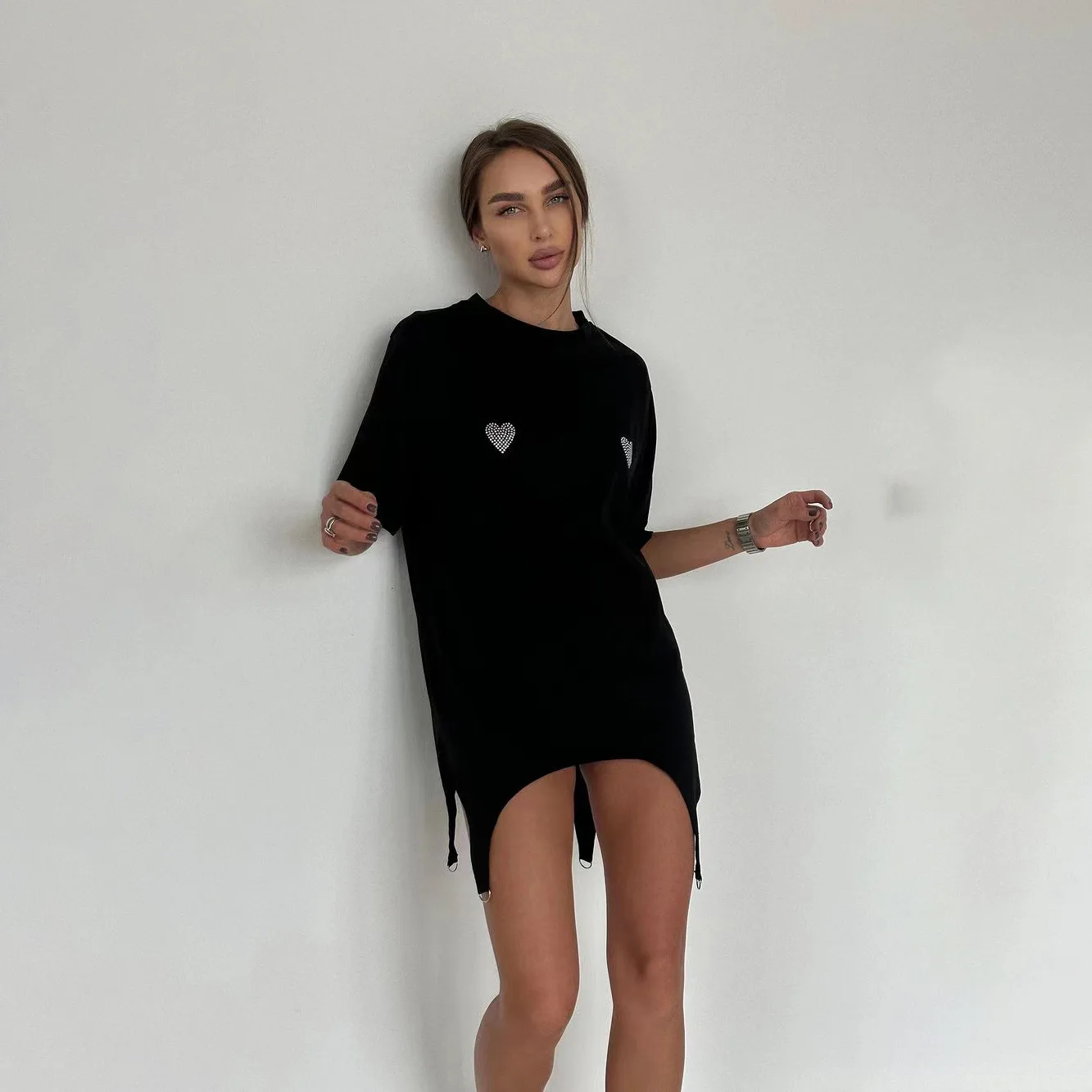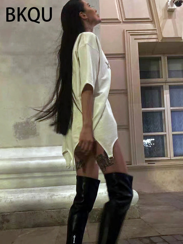 BKQU Women T-Shirts Oversized Short Sleeve Rhinestone Tees Pullovers Fashion Irregular O-Neck Diamond Loose T Shirt Harajuku Top
