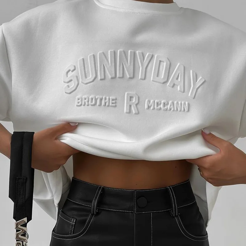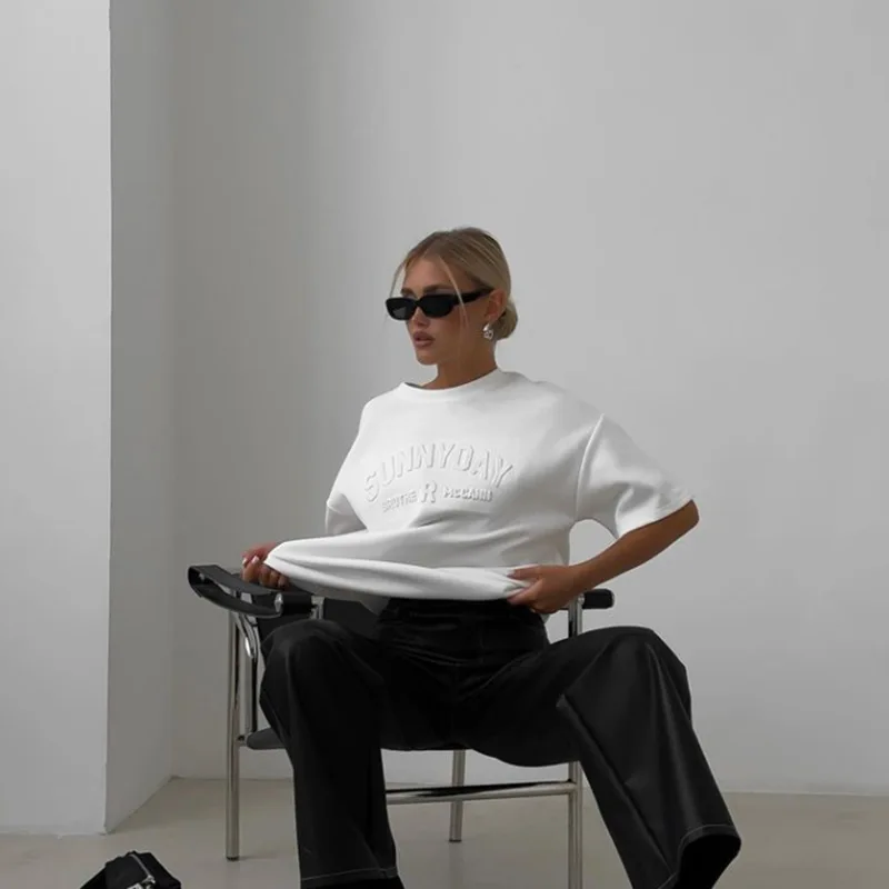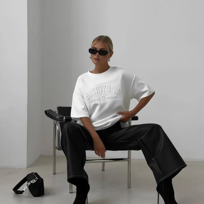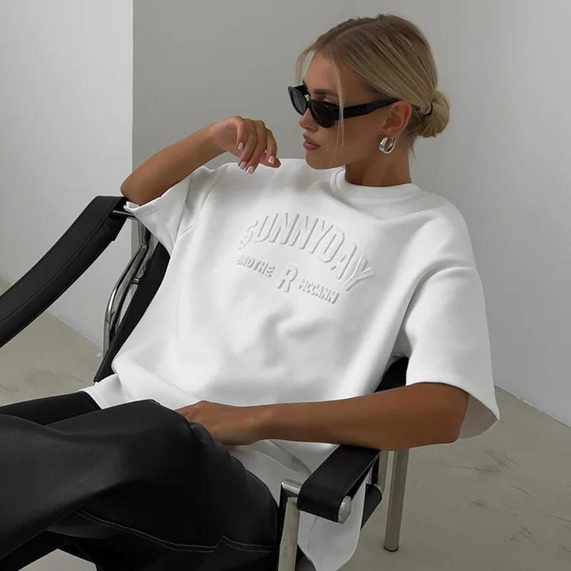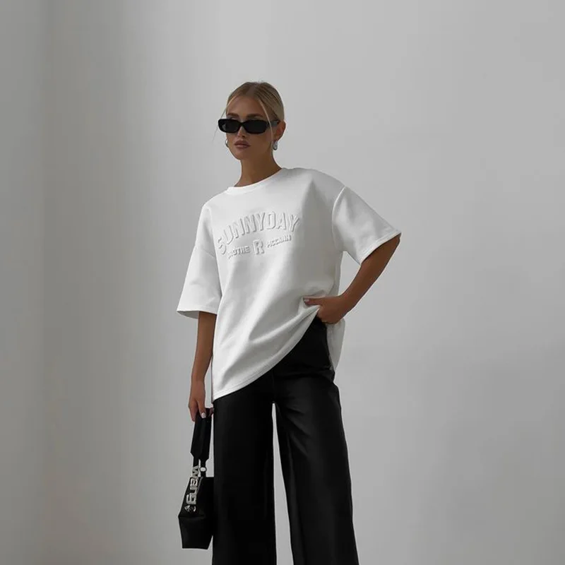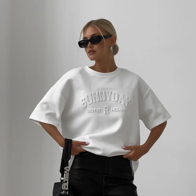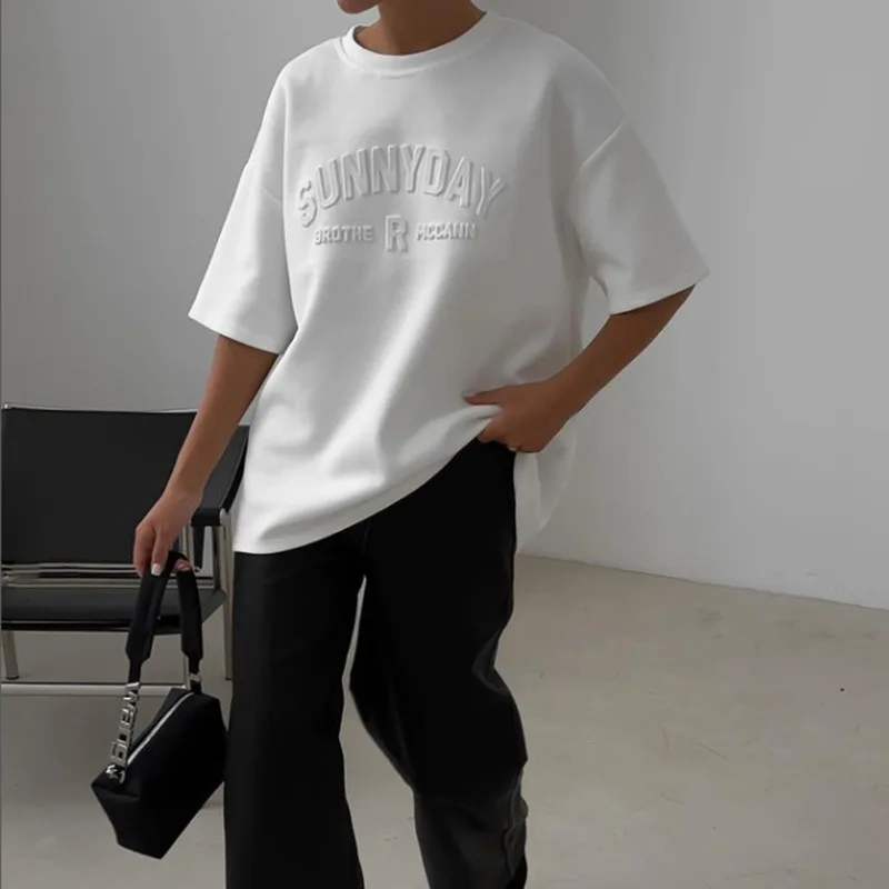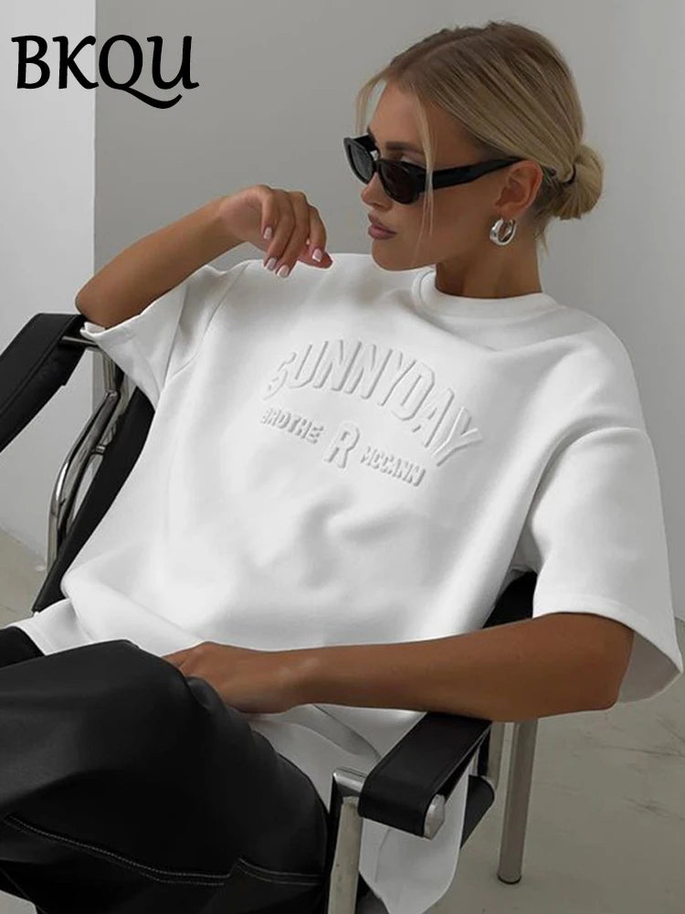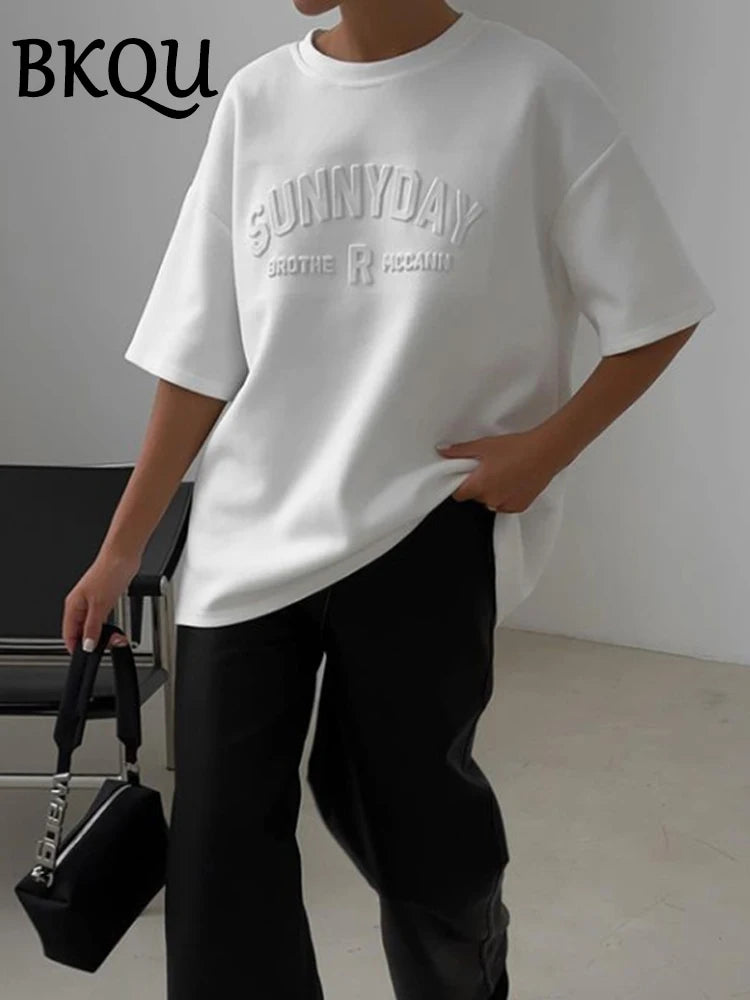 BKQU Womens Letter 3D Steel Printed T Shirt Summer 2024 Fashion Short Sleeve O Neck Cotton Soft Loose Tee Tops Oversized Shirts