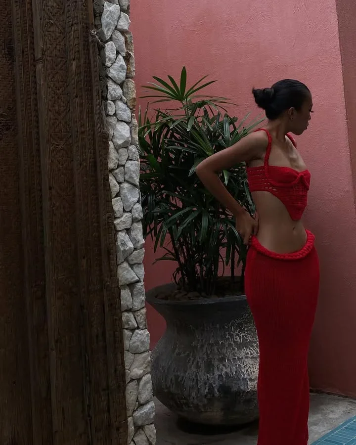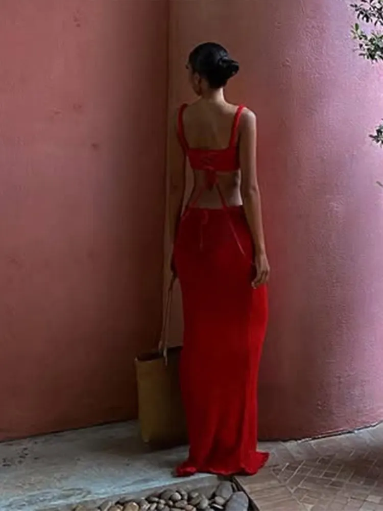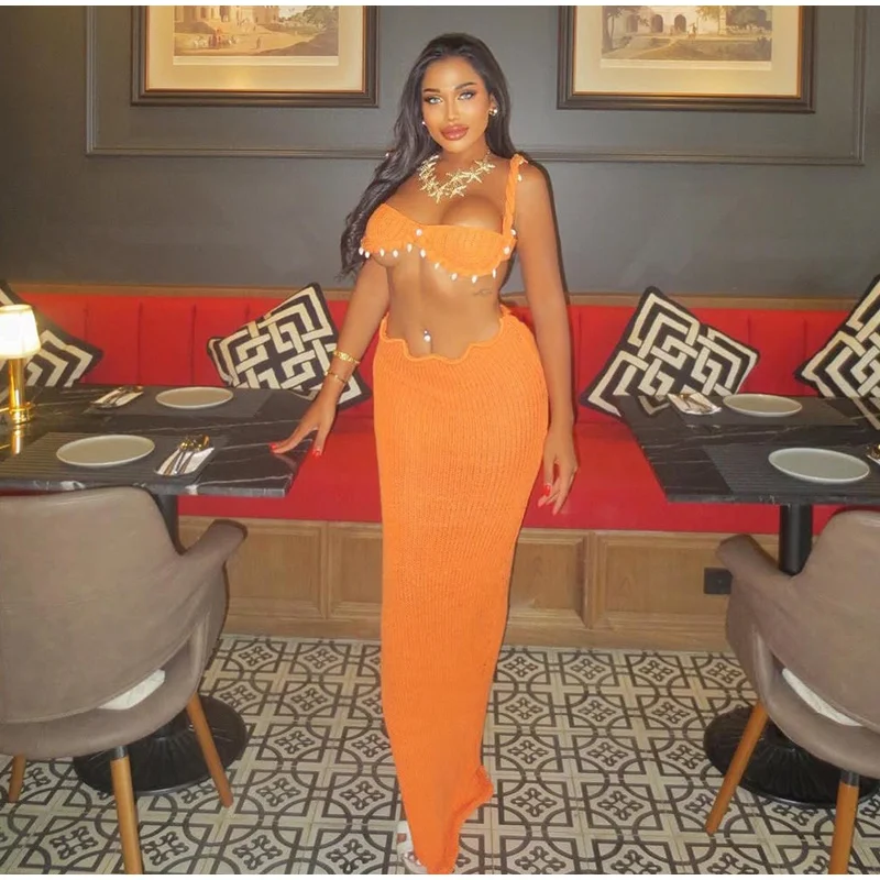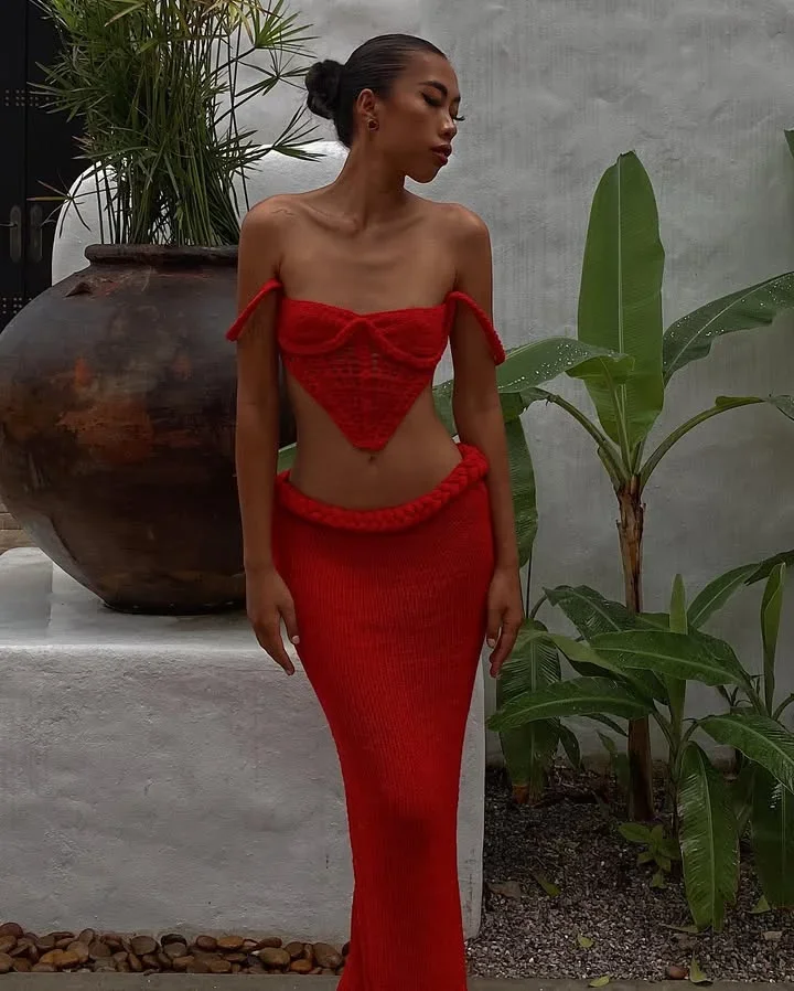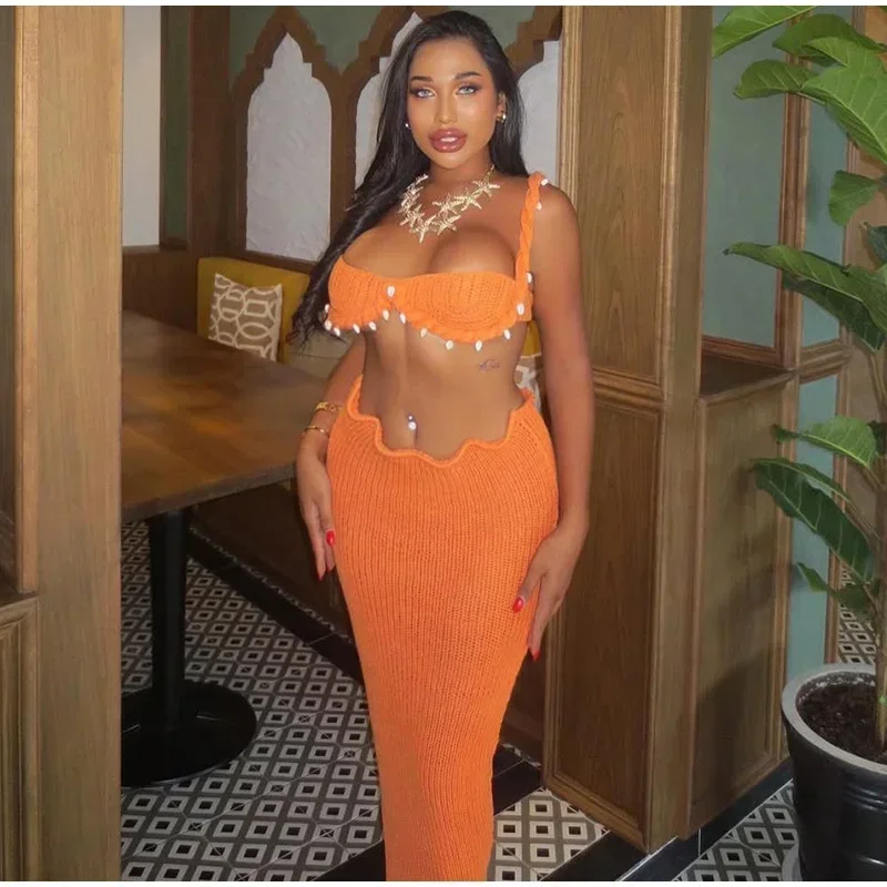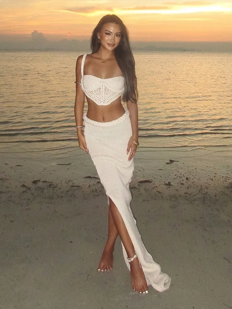 Chic Knitted Bikini Vest Skirt Sets Women Shell Twist Strap Backless Crop Top Hip Package Split Long Skirt 2 Piece Beach Outfits
