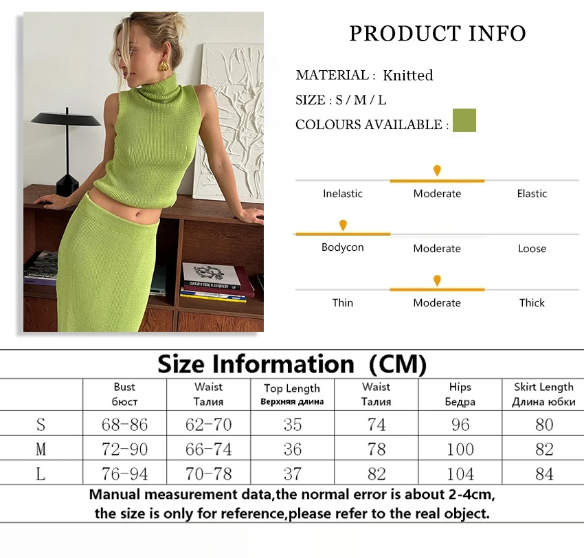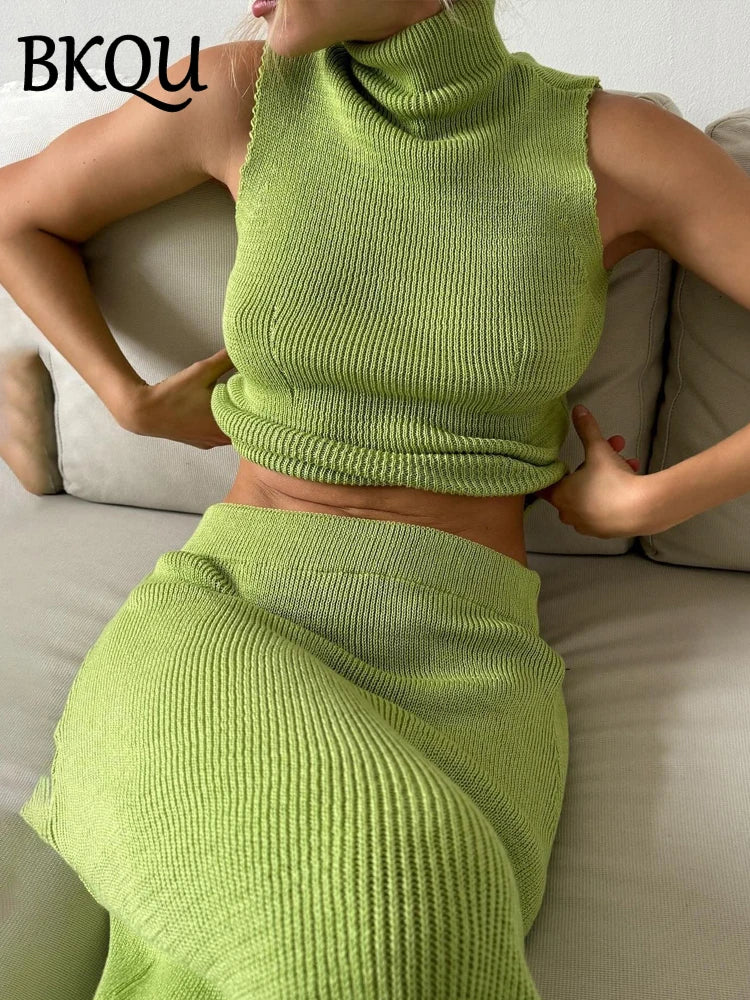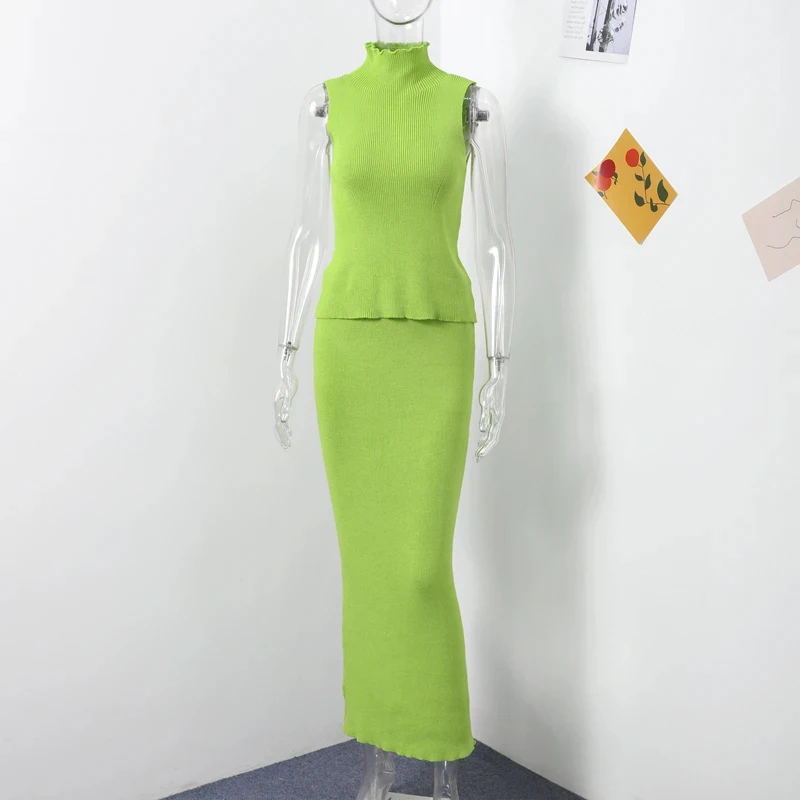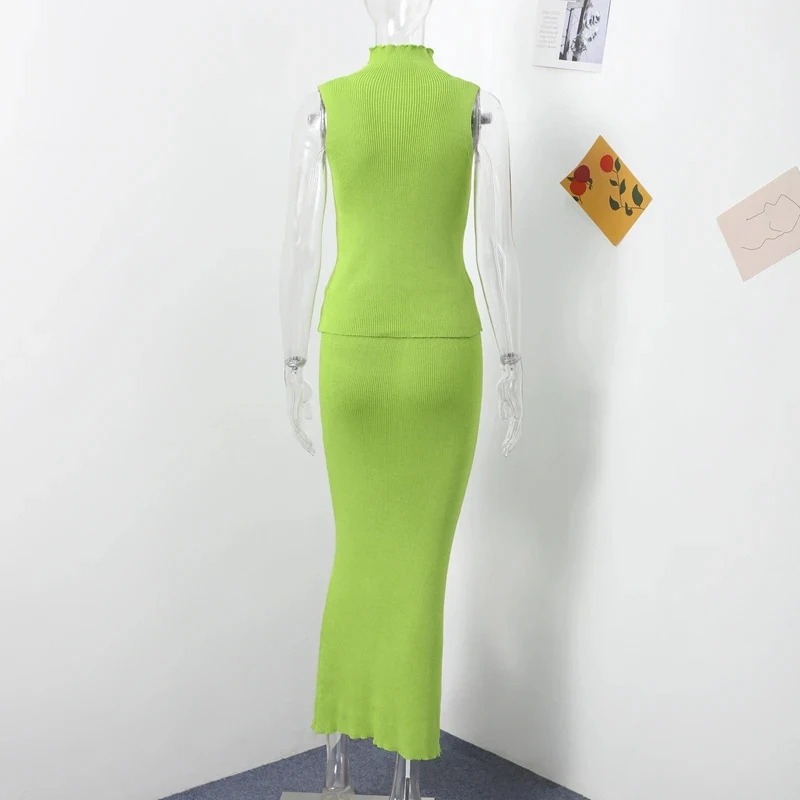 Summer Knitted Skirt Two Piece Sets Women Turtleneck Sleeveless Tank Tops Slim Elastic Waist Long Skirt Elegant Office Lady Suit
